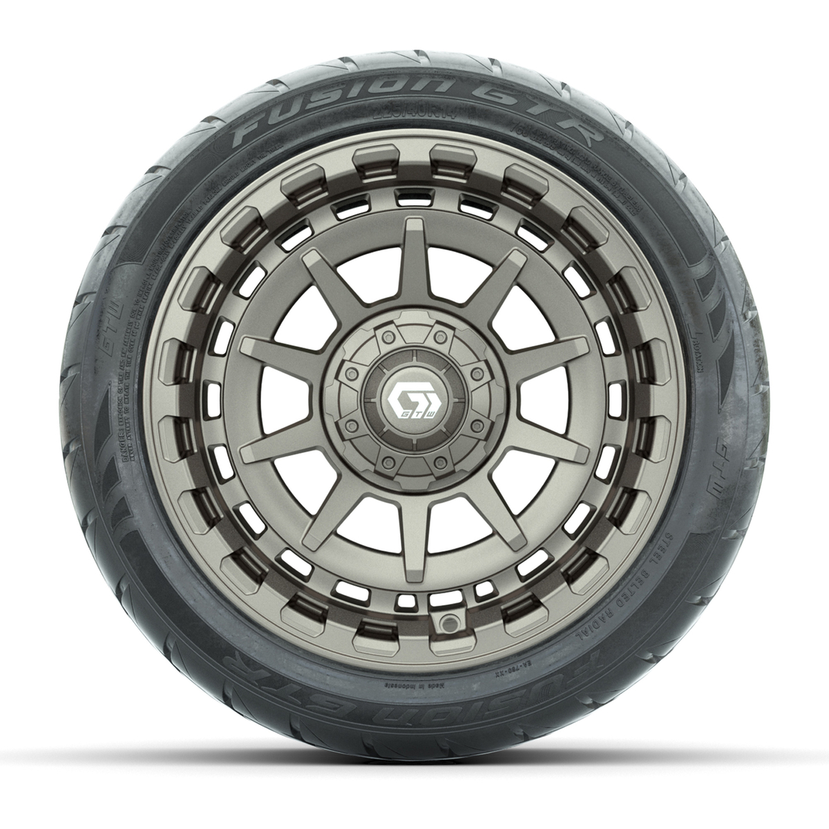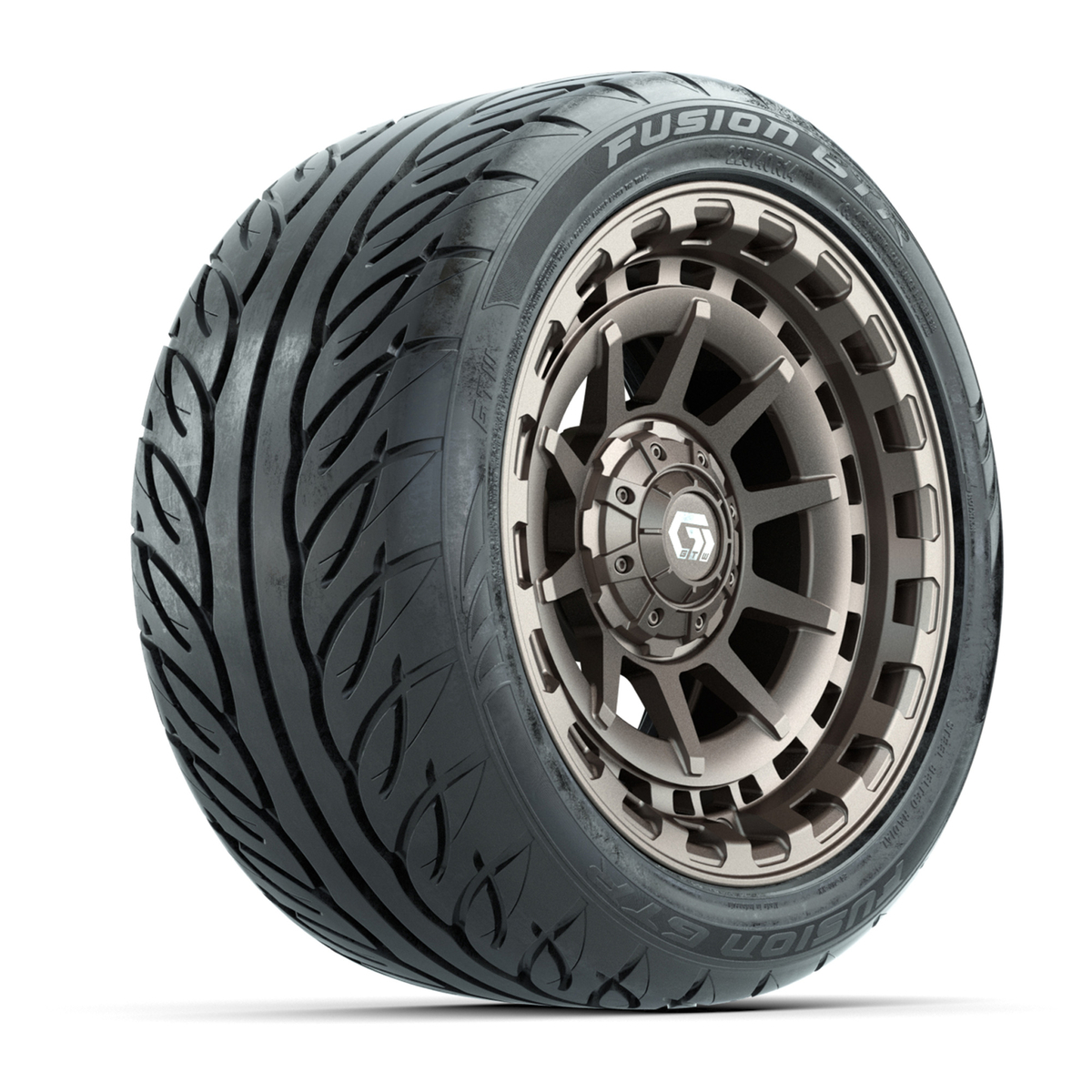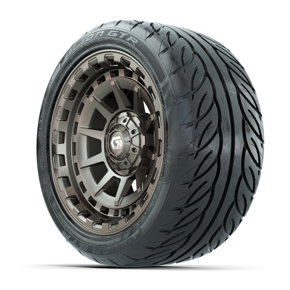 A set of (4) 14-inch GTW® Barricade Bronze golf cart wheels mounted on 225/40-R14 Fusion GTR Steel Belt Radial Street Tires