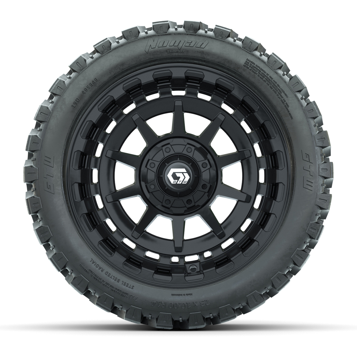 A set of (4) 14-inch GTW® Barricade Black golf cart wheels mounted on 23x10-R14 Nomad Steel Belt Radial All-Terrain Tires