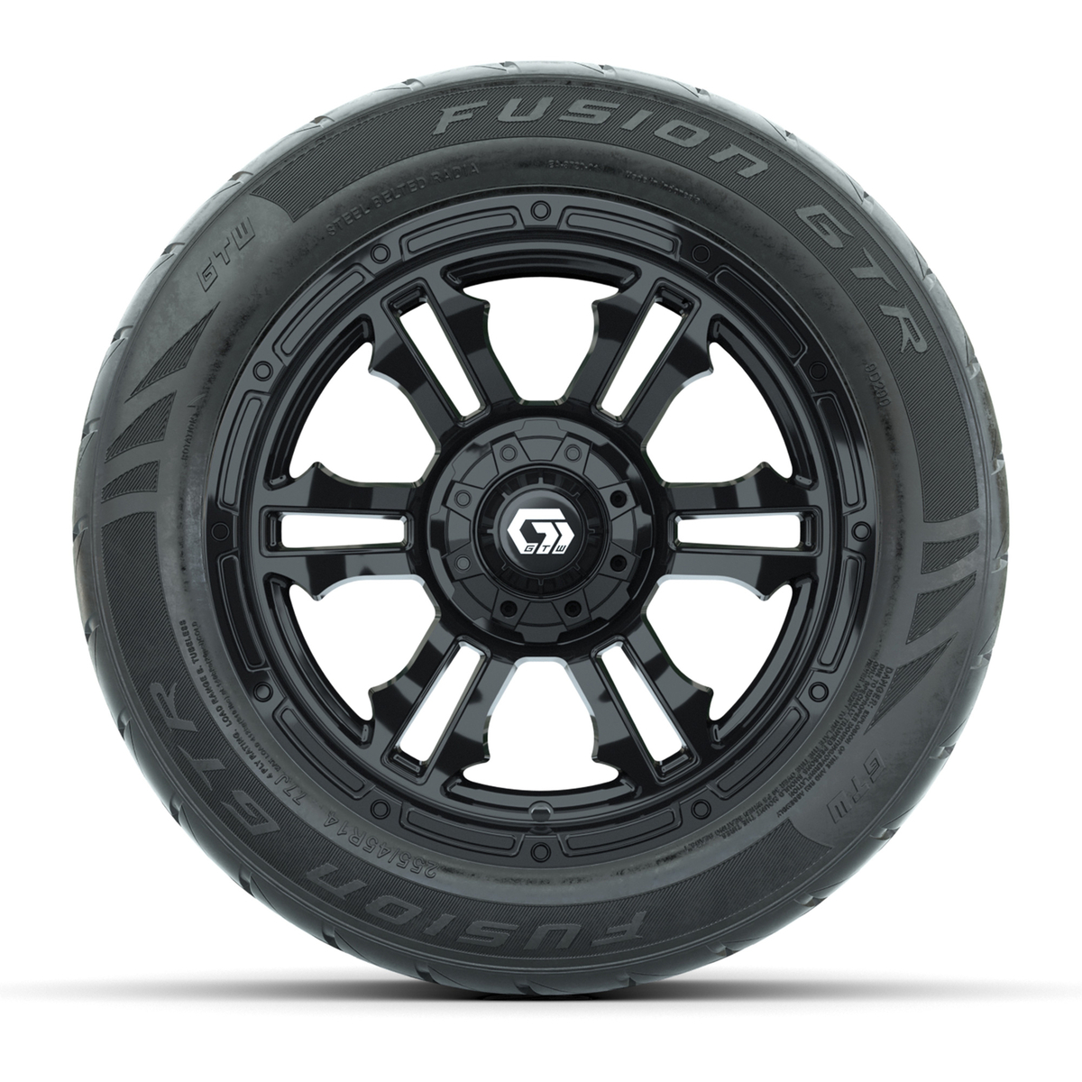 A set of (4) 14-inch GTW® Shogun Gloss Black golf cart wheels mounted on 255/45-R14 Fusion GTR Steel Belt Radial Street Tires