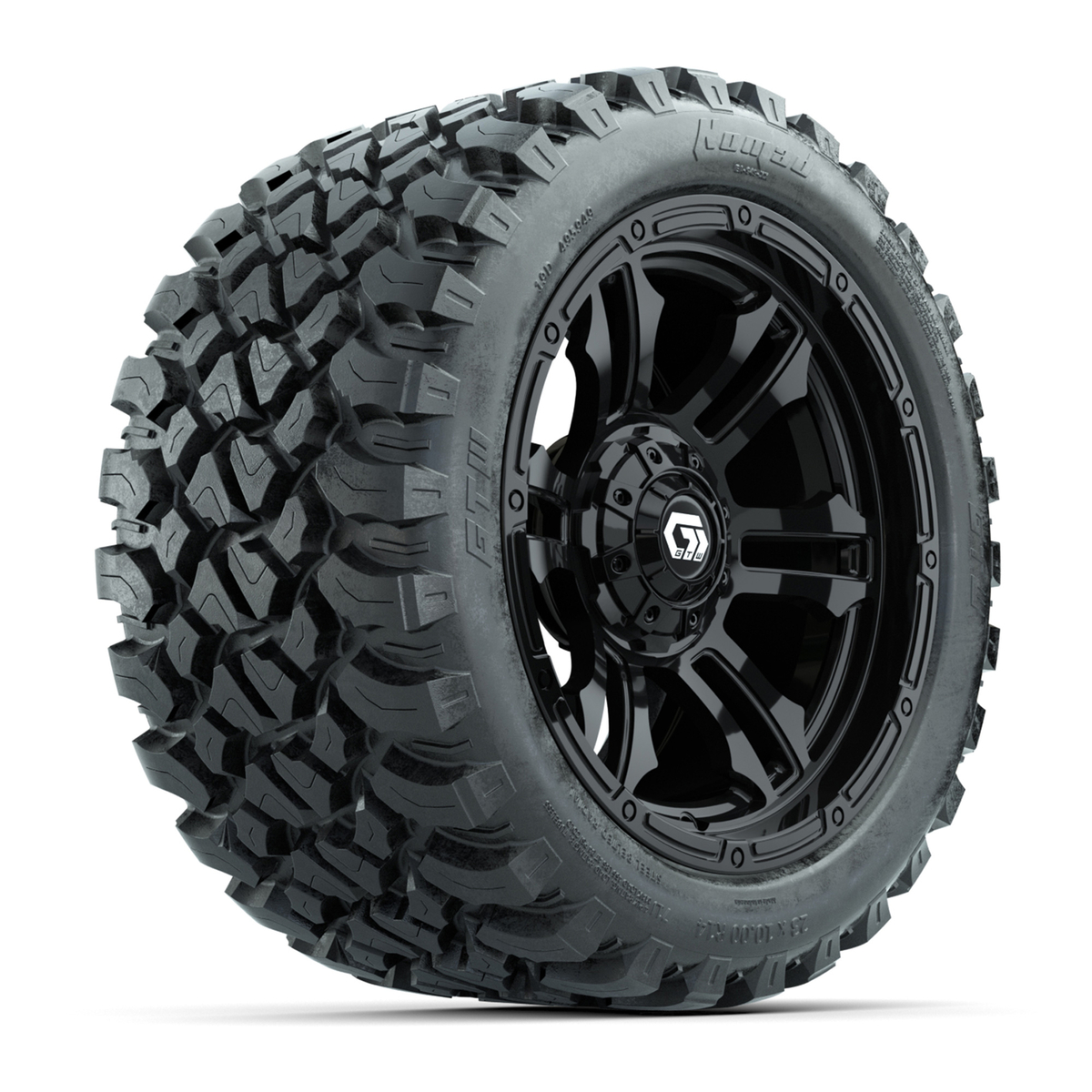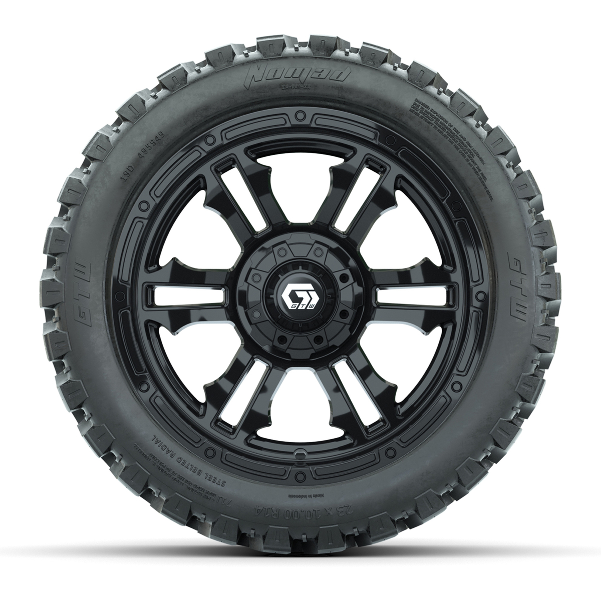 A set of (4) 14-inch GTW® Shogun Gloss Black golf cart wheels mounted on 23x10-R14 Nomad Steel Belt Radial All-Terrain Tires
