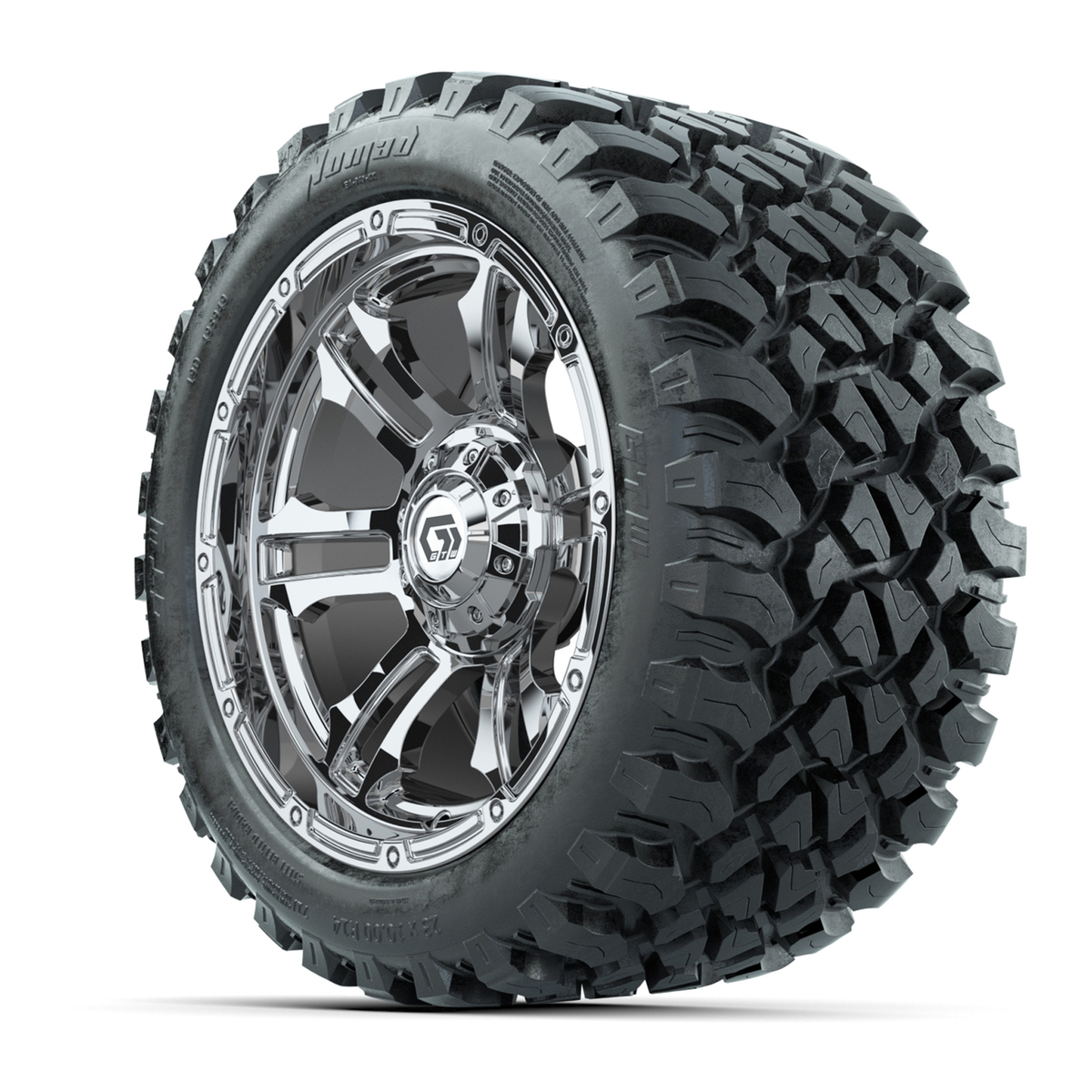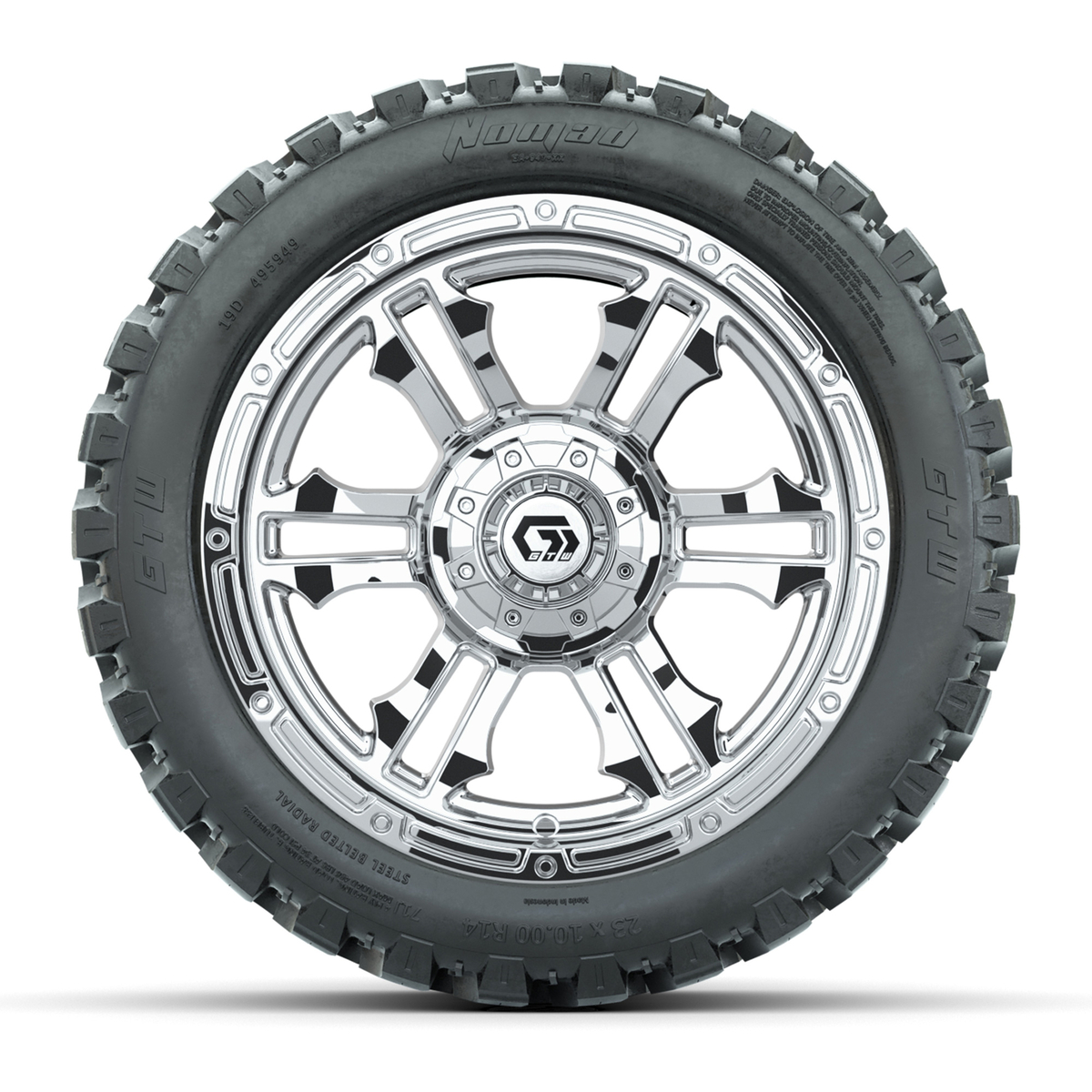 A set of (4) 14-inch GTW® Shogun Chrome golf cart wheels mounted on 23x10-R14 Nomad Steel Belt Radial All-Terrain Tires