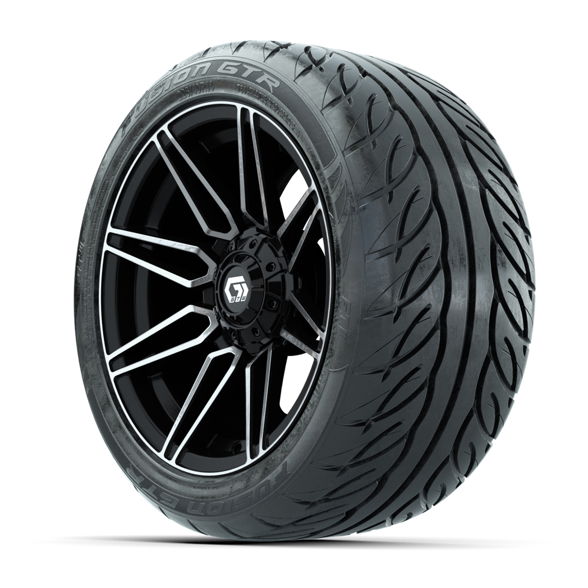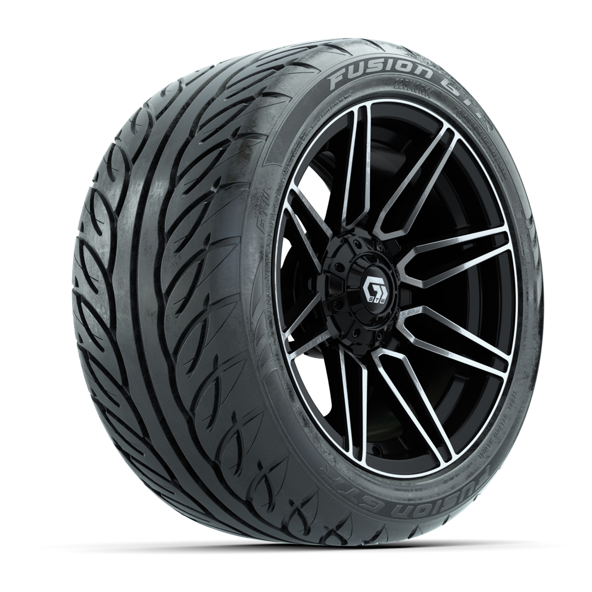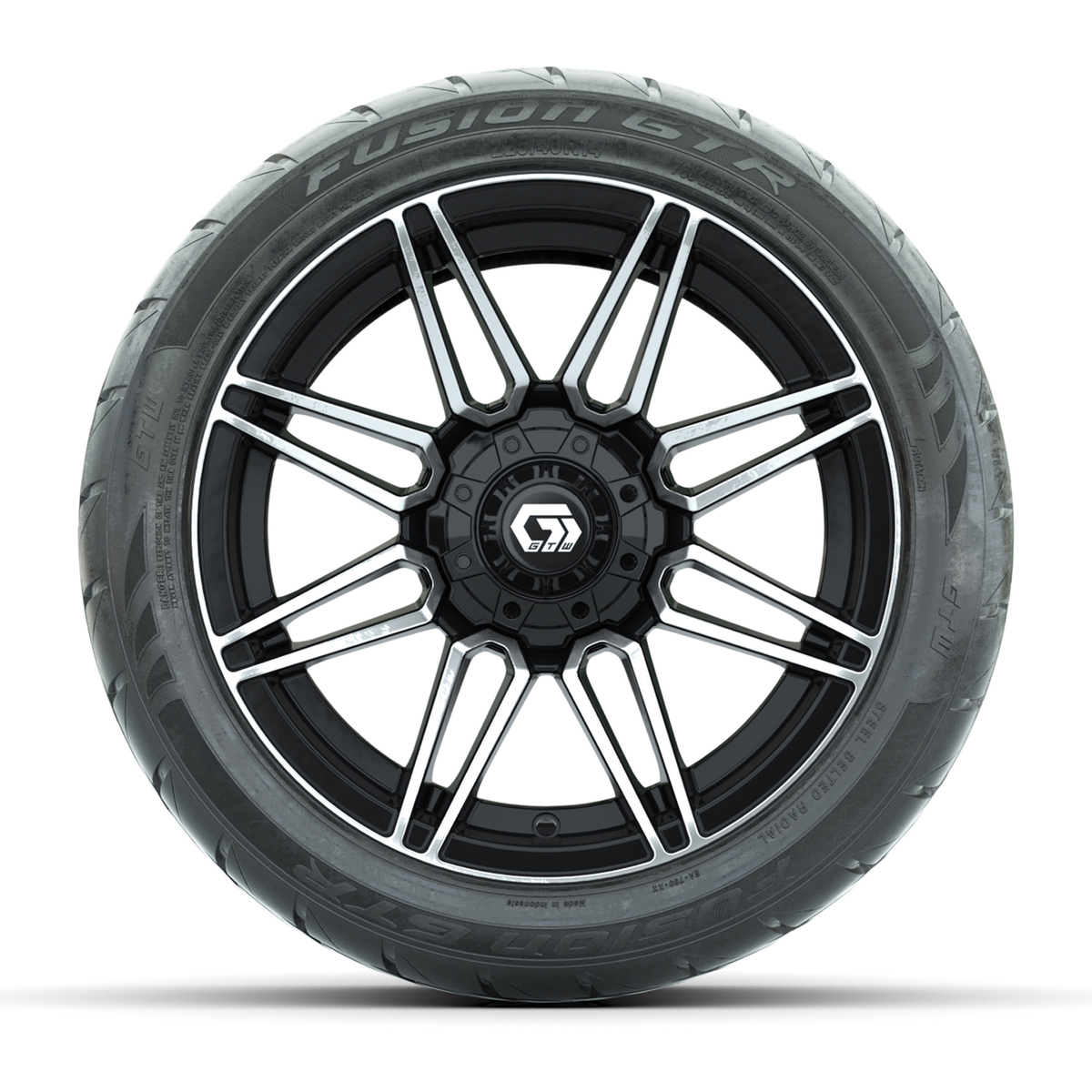 A set of (4) 14-inch GTW® Stealth Black/Machined golf cart wheels mounted on 225/40-R14 Fusion GTR Steel Belt Radial Street Tires