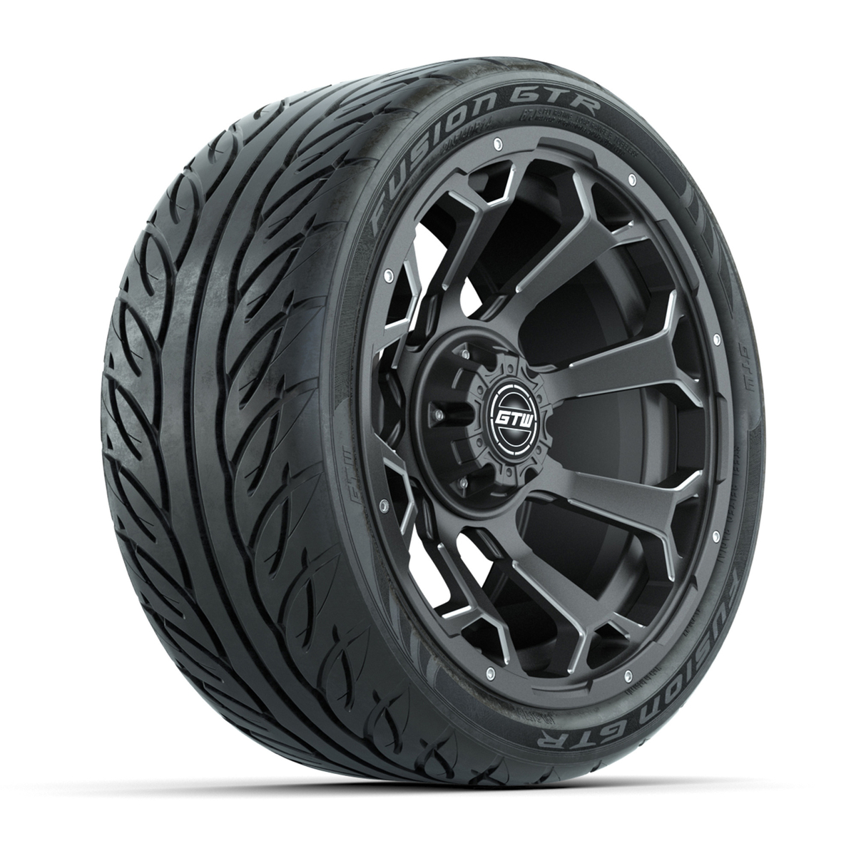 A set of (4) 14-inch GTW® Raven Matte Gray/Ball Milled golf cart wheels mounted on 205/40-R14 Fusion GTR Steel Belt Radial Street Tires