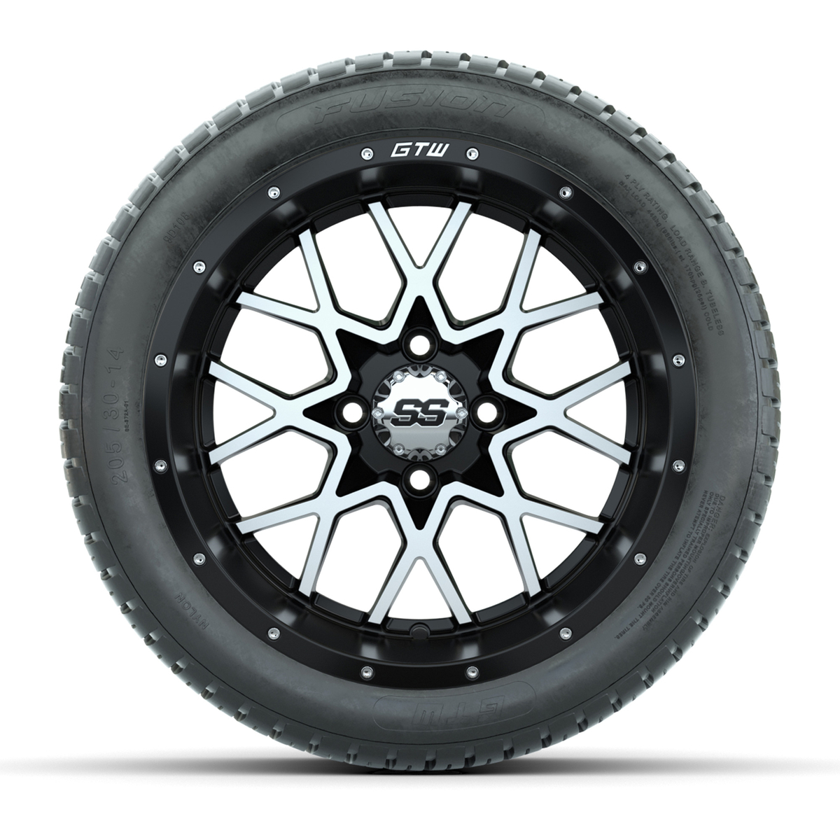 A set of (4) 14-inch GTW® Vortex 2 Matte Black/Machined golf cart wheels mounted on 205/30-14 Fusion Street Tires