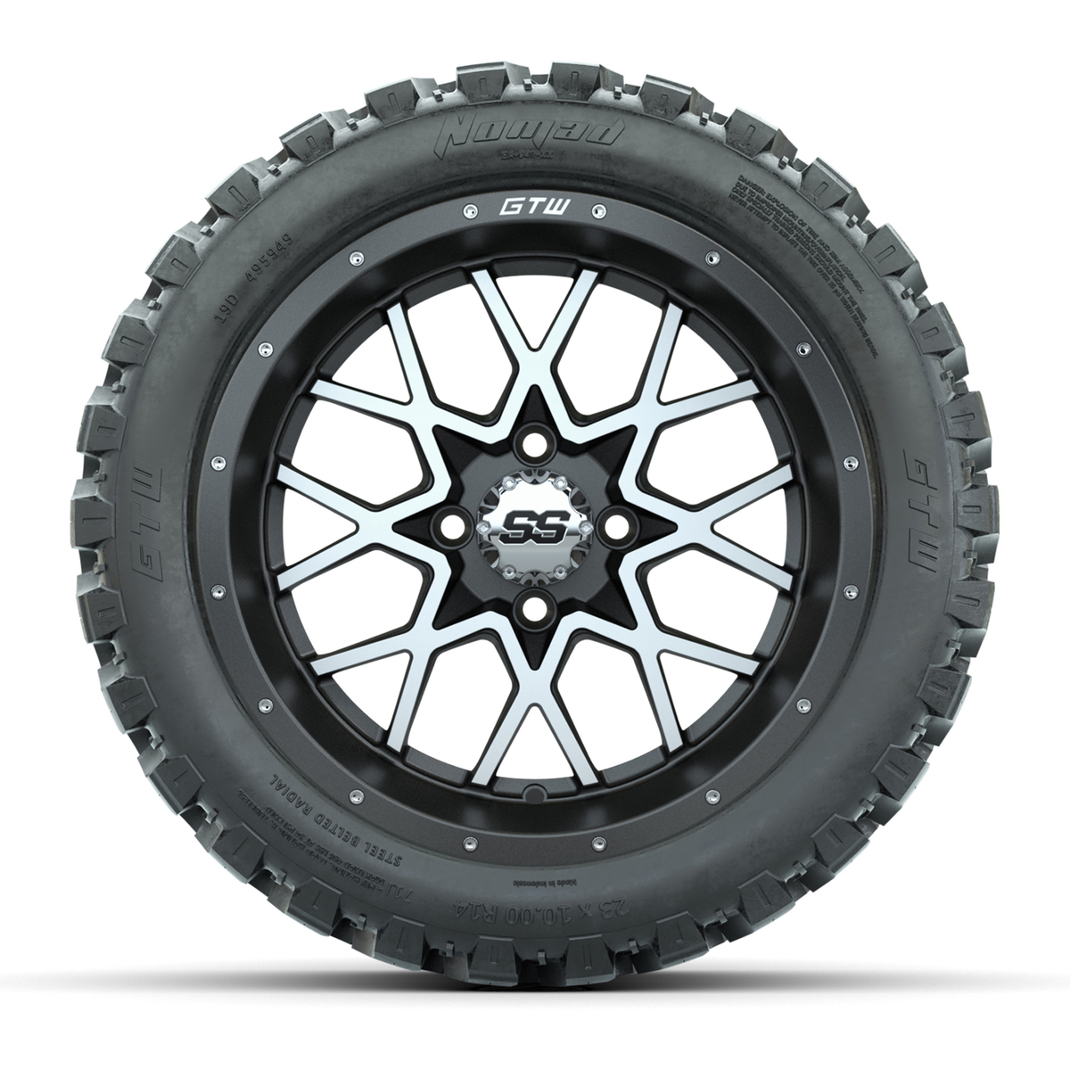 A set of (4) 14-inch GTW® Vortex 2 Matte Gray/Machined golf cart wheels mounted on 23x10-R14 Nomad Steel Belt Radial All-Terrain Tires
