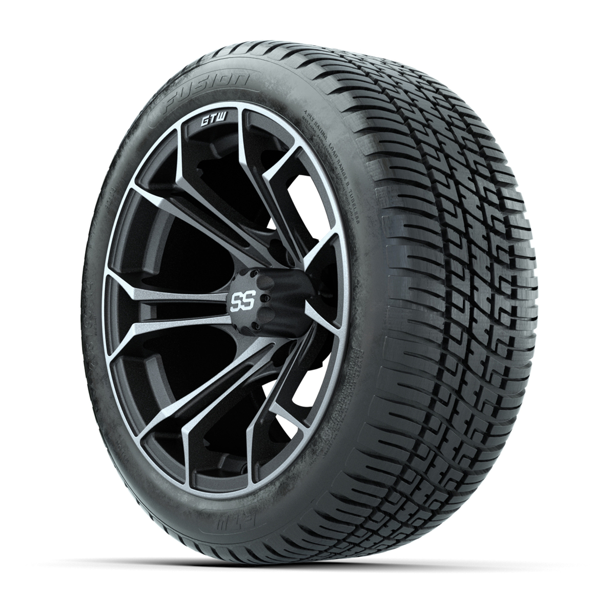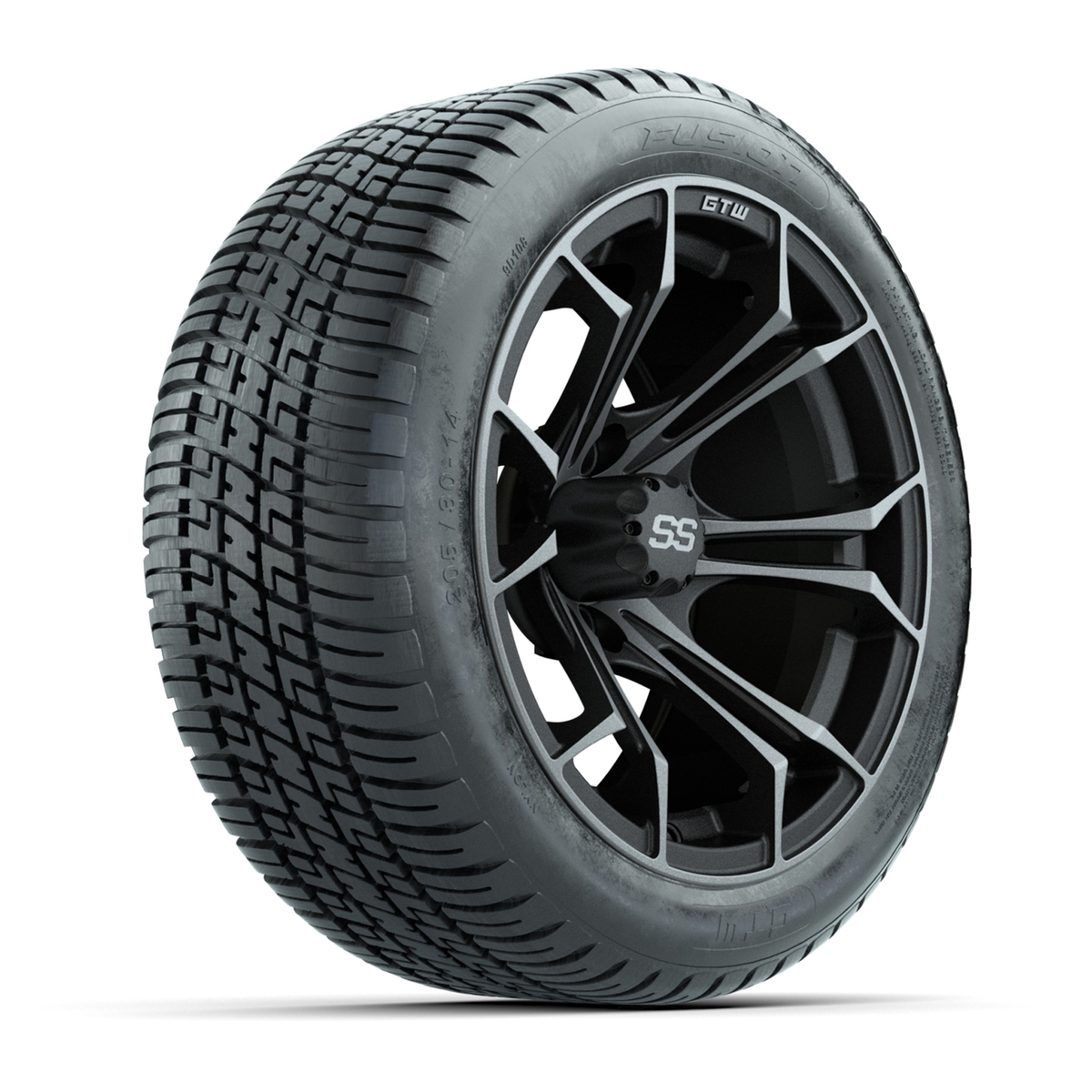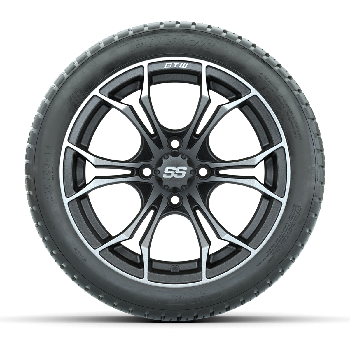 A set of (4) 14-inch GTW® Spyder Matte Gray/Machined golf cart wheels mounted on 205/30-14 Fusion Street Tires