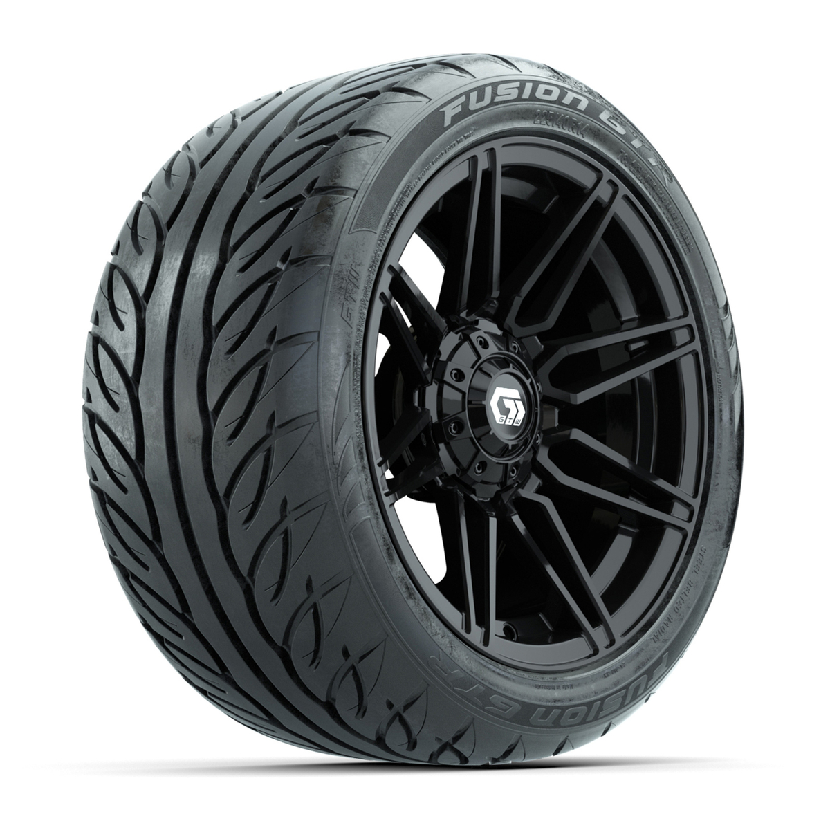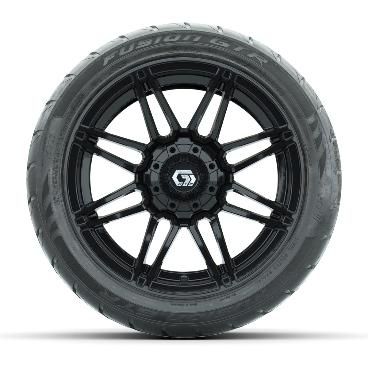 A set of (4) 14-inch GTW® Stealth Gloss Black golf cart wheels mounted on 225/40-R14 Fusion GTR Steel Belt Radial Street Tires