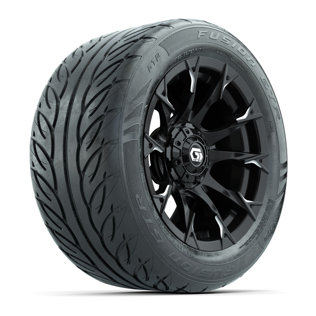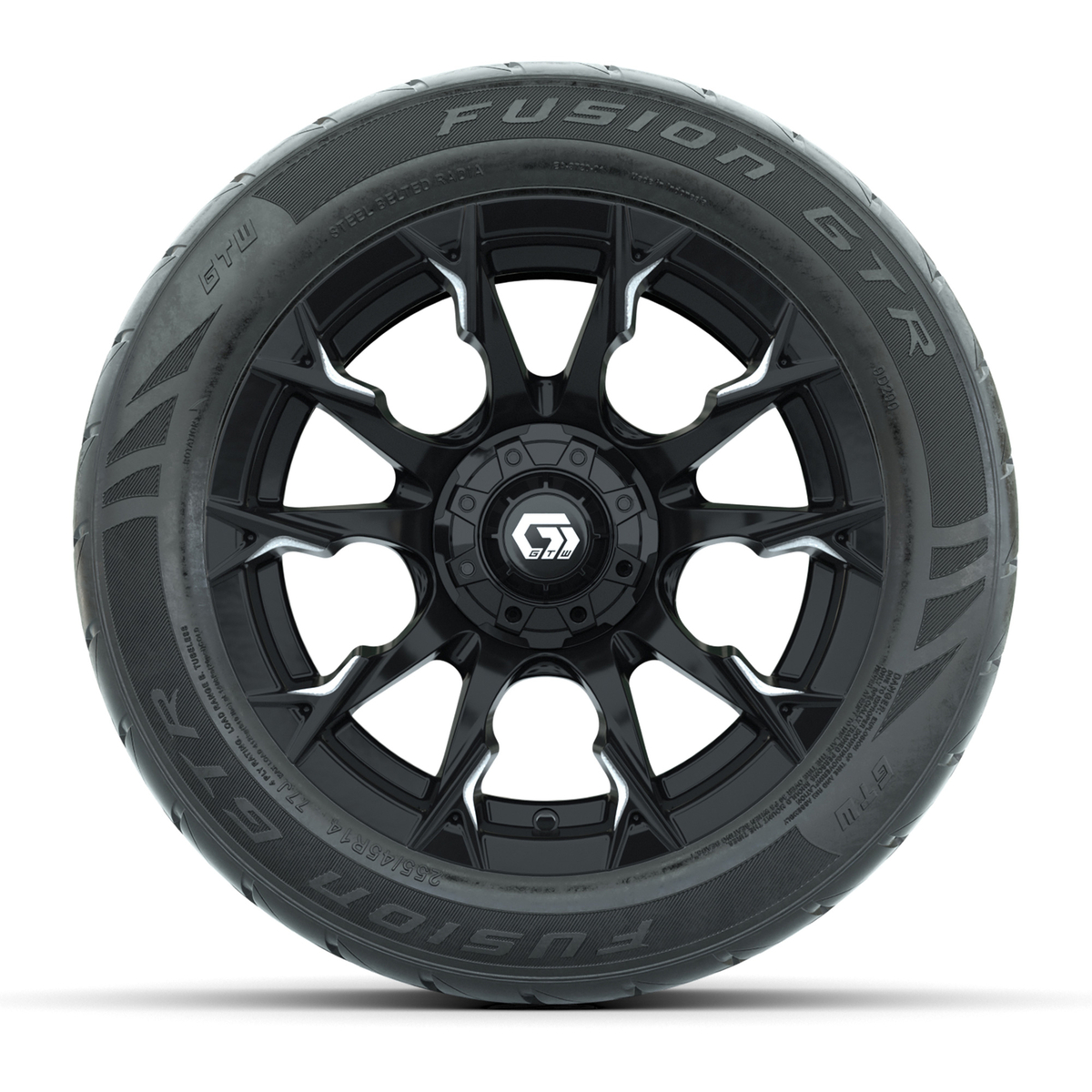 A set of (4) 14-inch GTW® Diablo Gloss Black/Machined golf cart wheels mounted on 255/45-R14 Fusion GTR Steel Belt Radial Street Tires