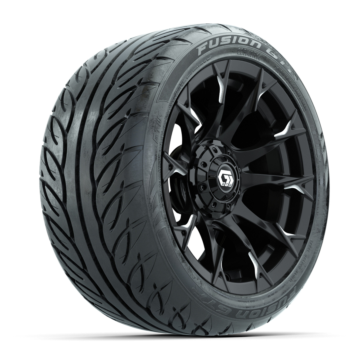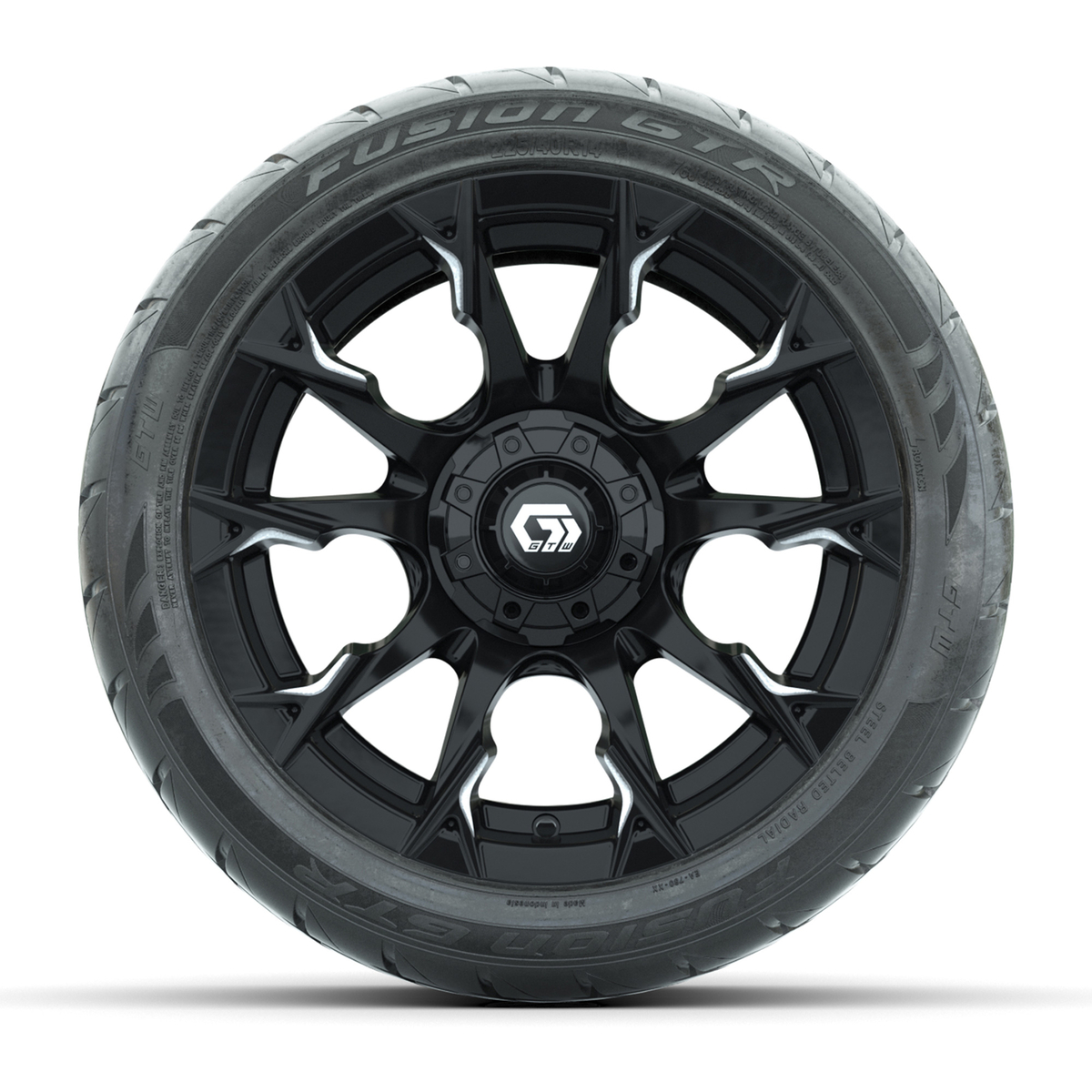 A set of (4) 14-inch GTW® Diablo Gloss Black/Machined golf cart wheels mounted on 225/40-R14 Fusion GTR Steel Belt Radial Street Tires