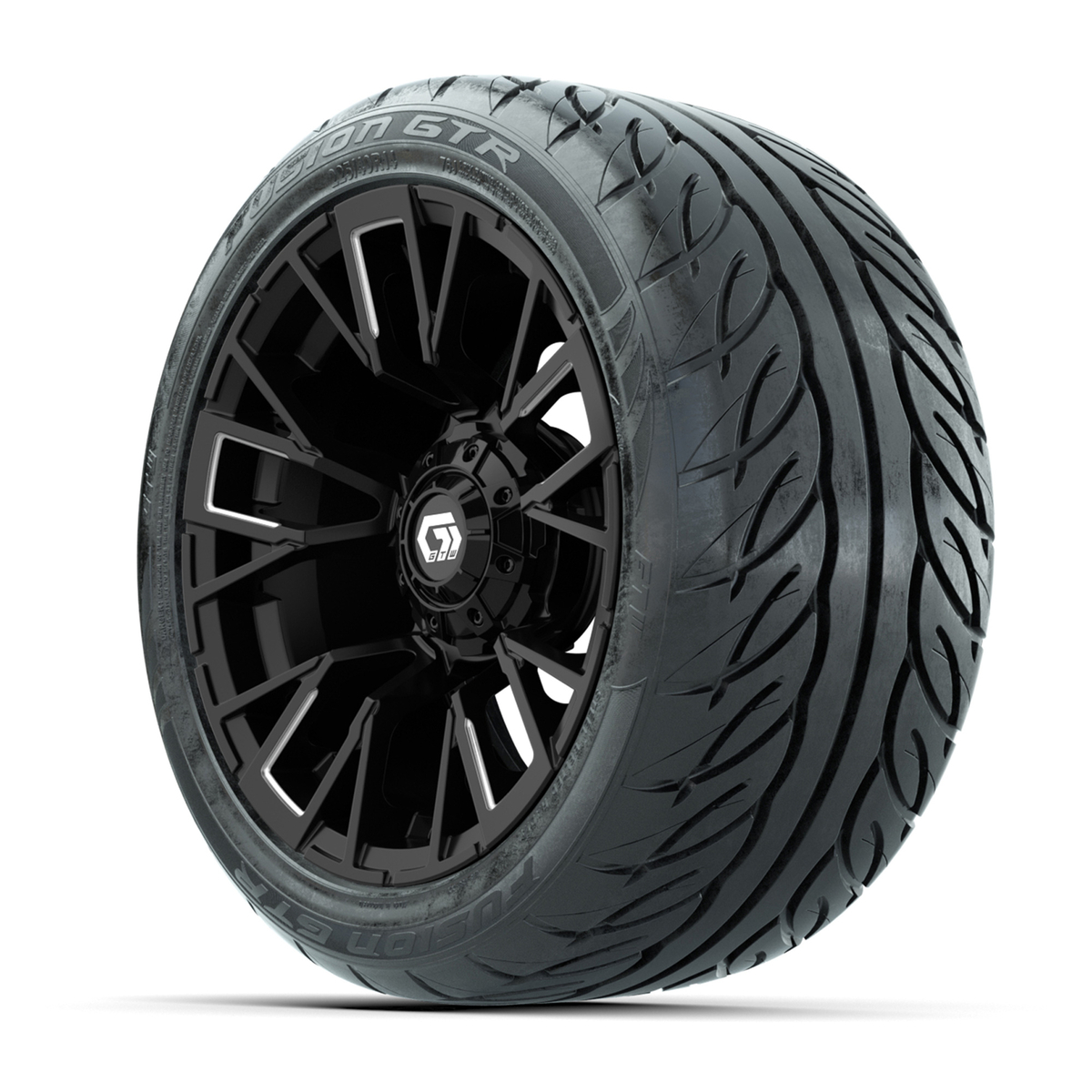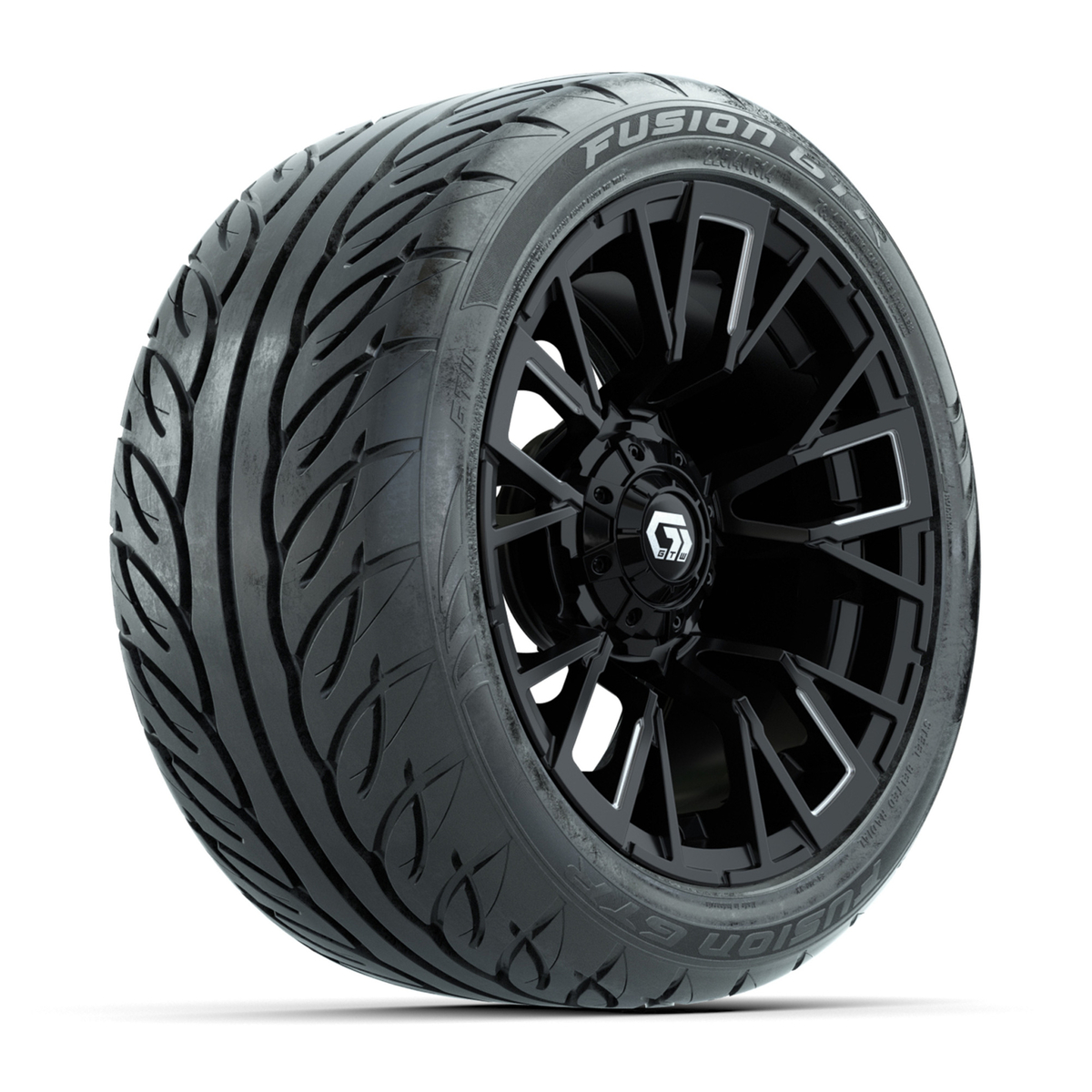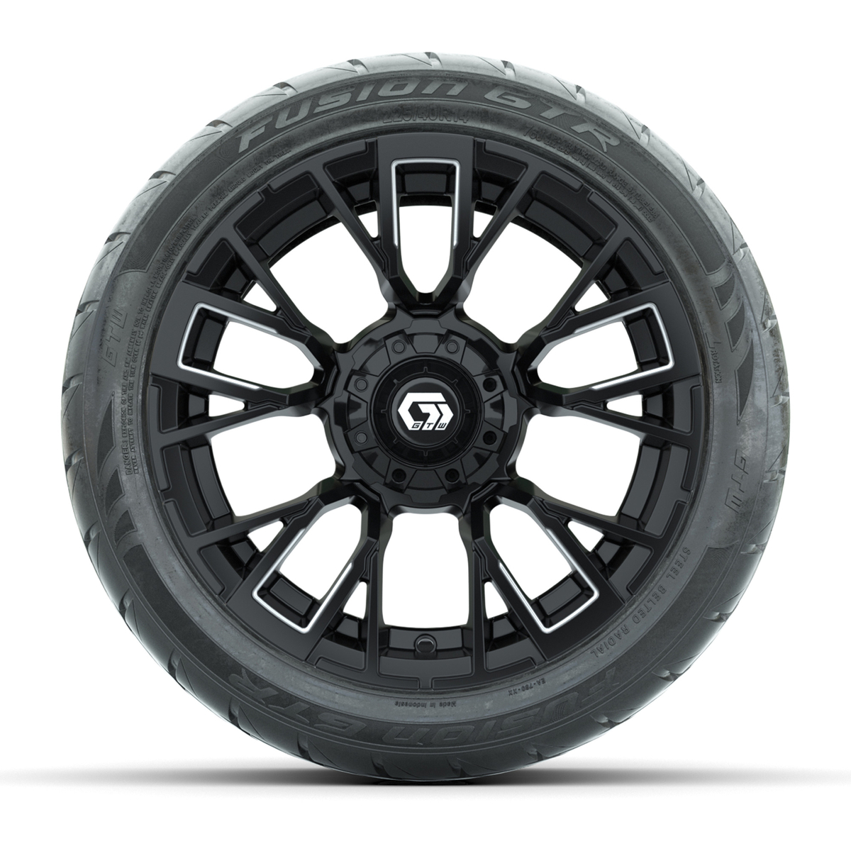 A set of (4) 14-inch GTW® Vandal Matte Black/Machined golf cart wheels mounted on 225/40-R14 Fusion GTR Steel Belt Radial Street Tires