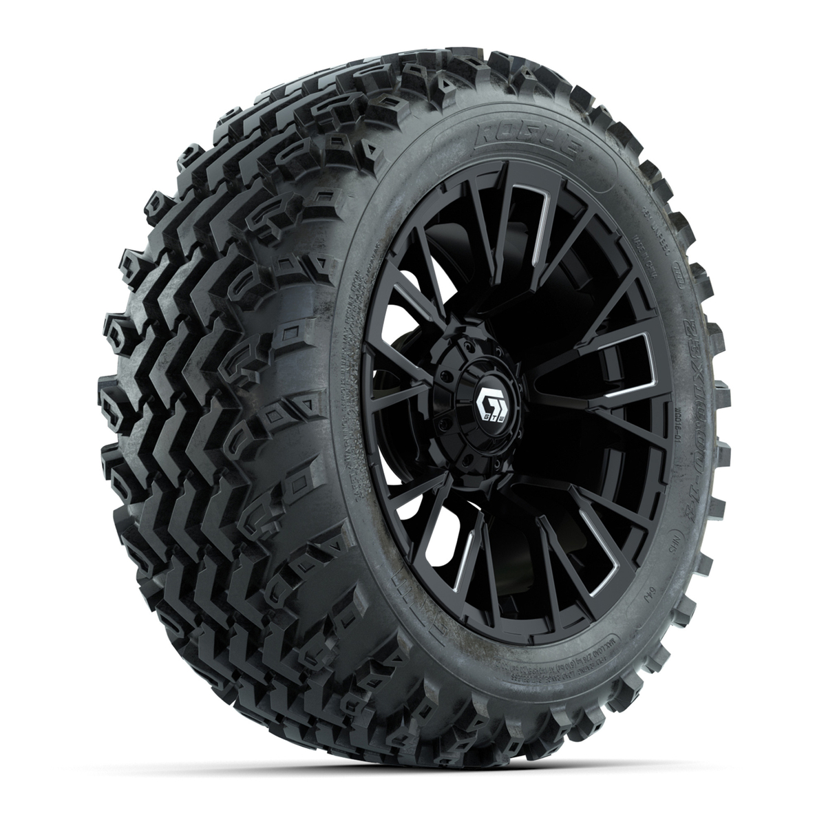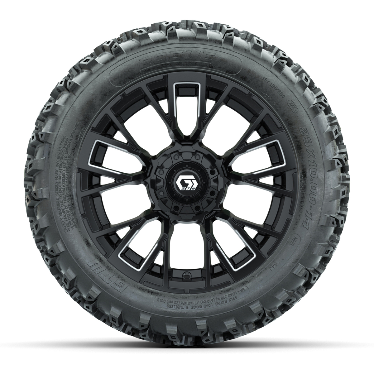 A set of (4) 14-inch GTW® Vandal Matte Black/Machined golf cart wheels mounted on 23x10-14 Rogue All-Terrain Tires