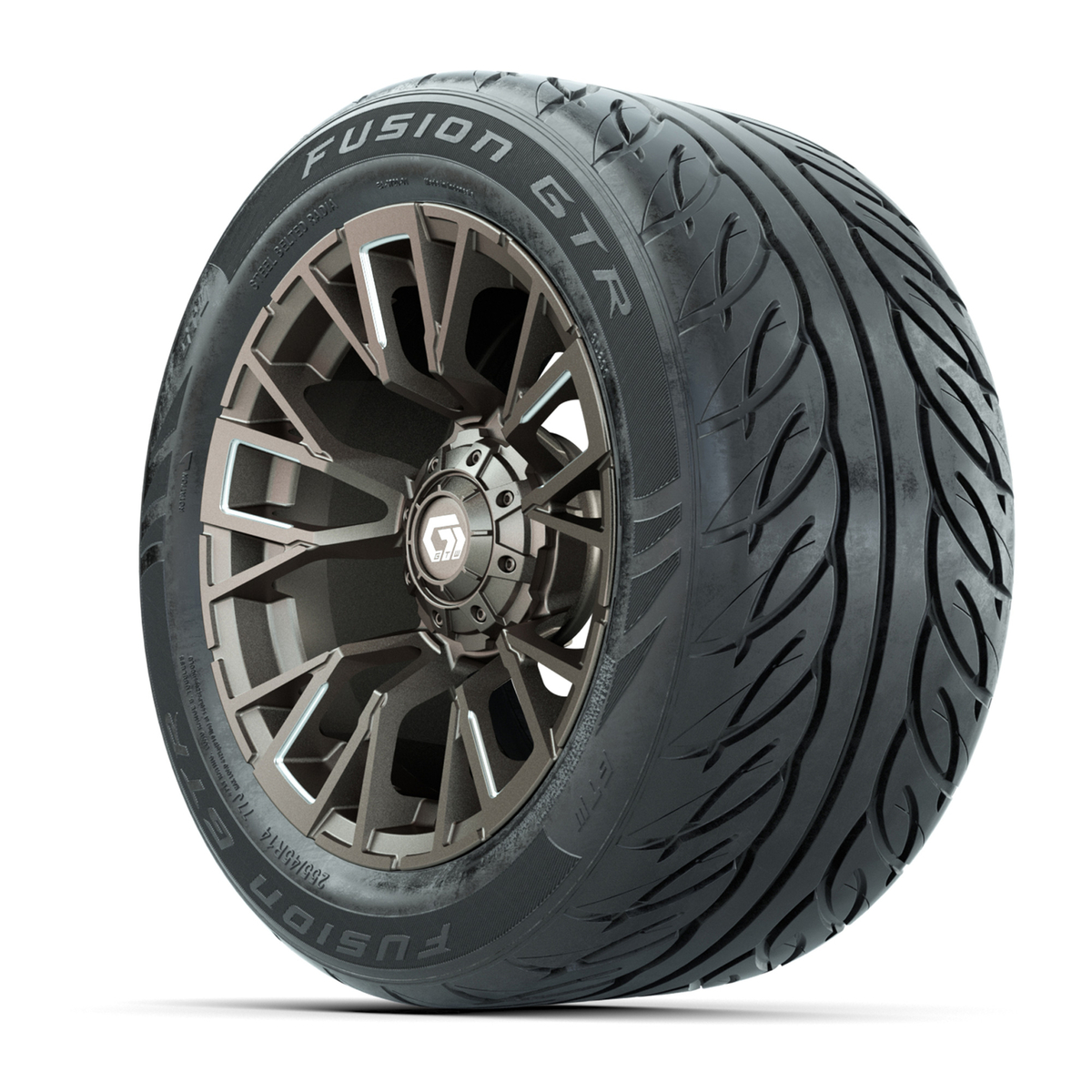 A set of (4) 14-inch GTW® Vandal Bronze/Machined golf cart wheels mounted on 255/45-R14 Fusion GTR Steel Belt Radial Street Tires
