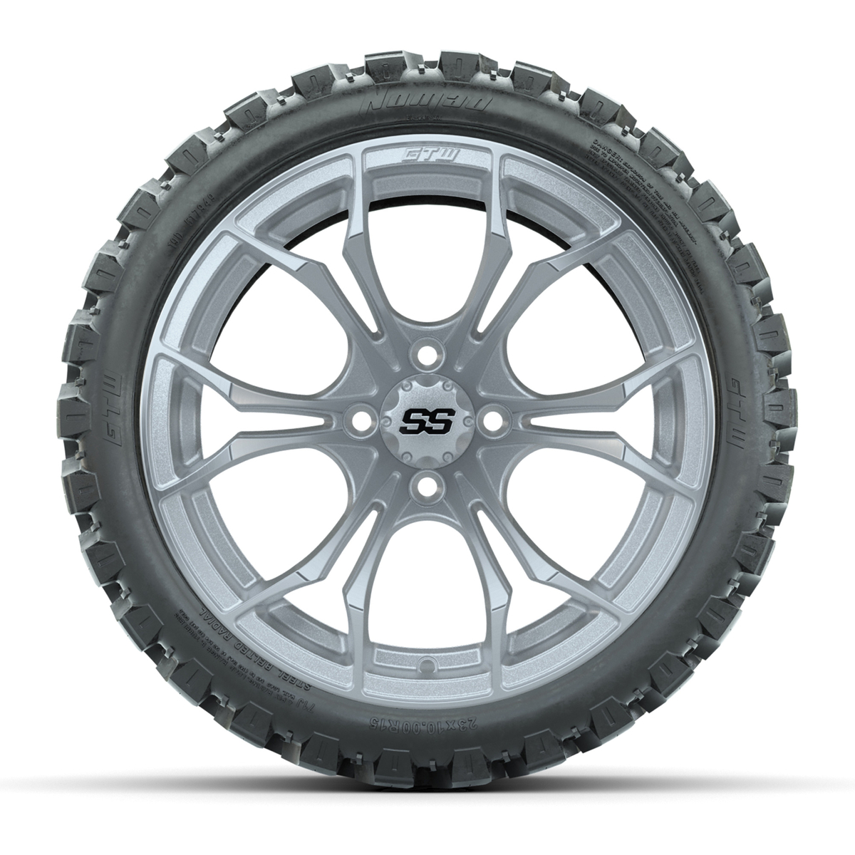 A set of (4) 15-inch GTW® Spyder Silver Brush golf cart wheels mounted on 23X10-R15 Nomad Steel Belt Radial All-Terrain Tires