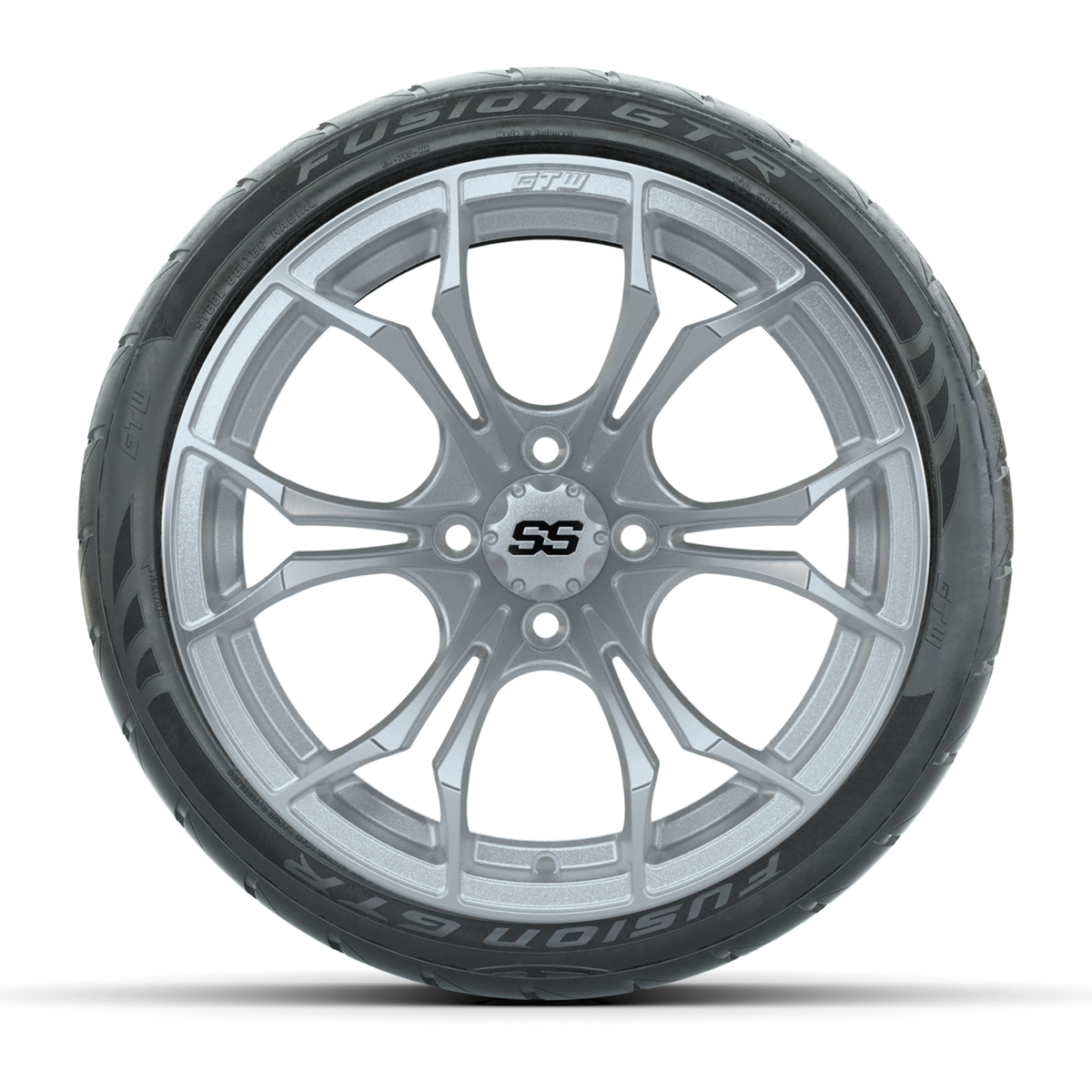 A set of (4) 15-inch GTW® Spyder Silver Brush golf cart wheels mounted on 215/40-R15 Fusion GTR Steel Belt Radial Street Tires