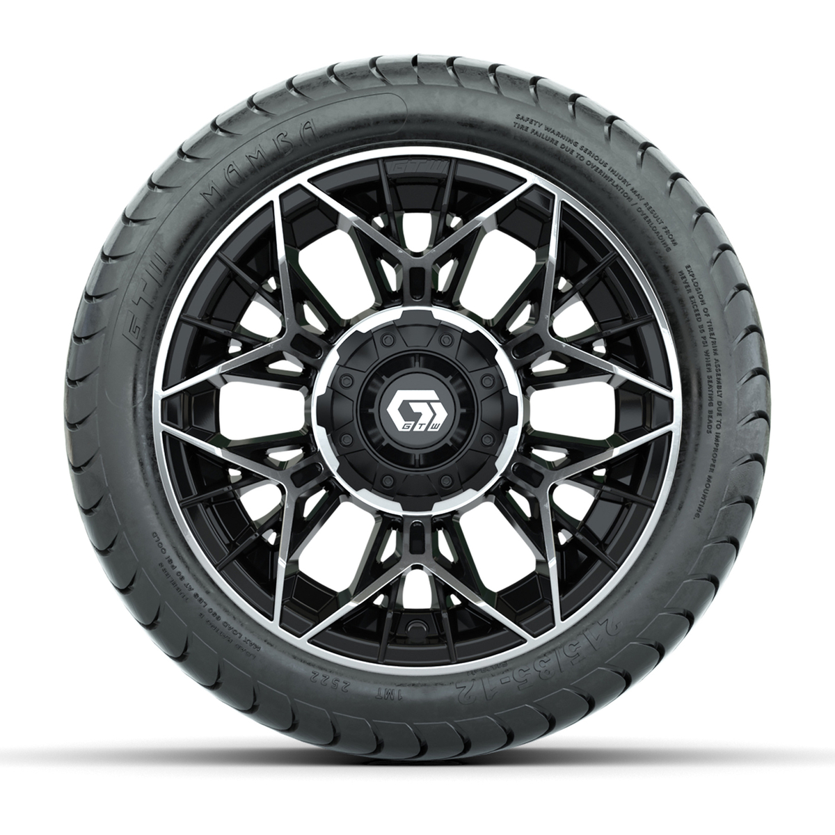 A set of (4) 12-inch GTW® Stellar machined face with black golf cart wheels 215/35-12 GTW® Mamba Street Tires