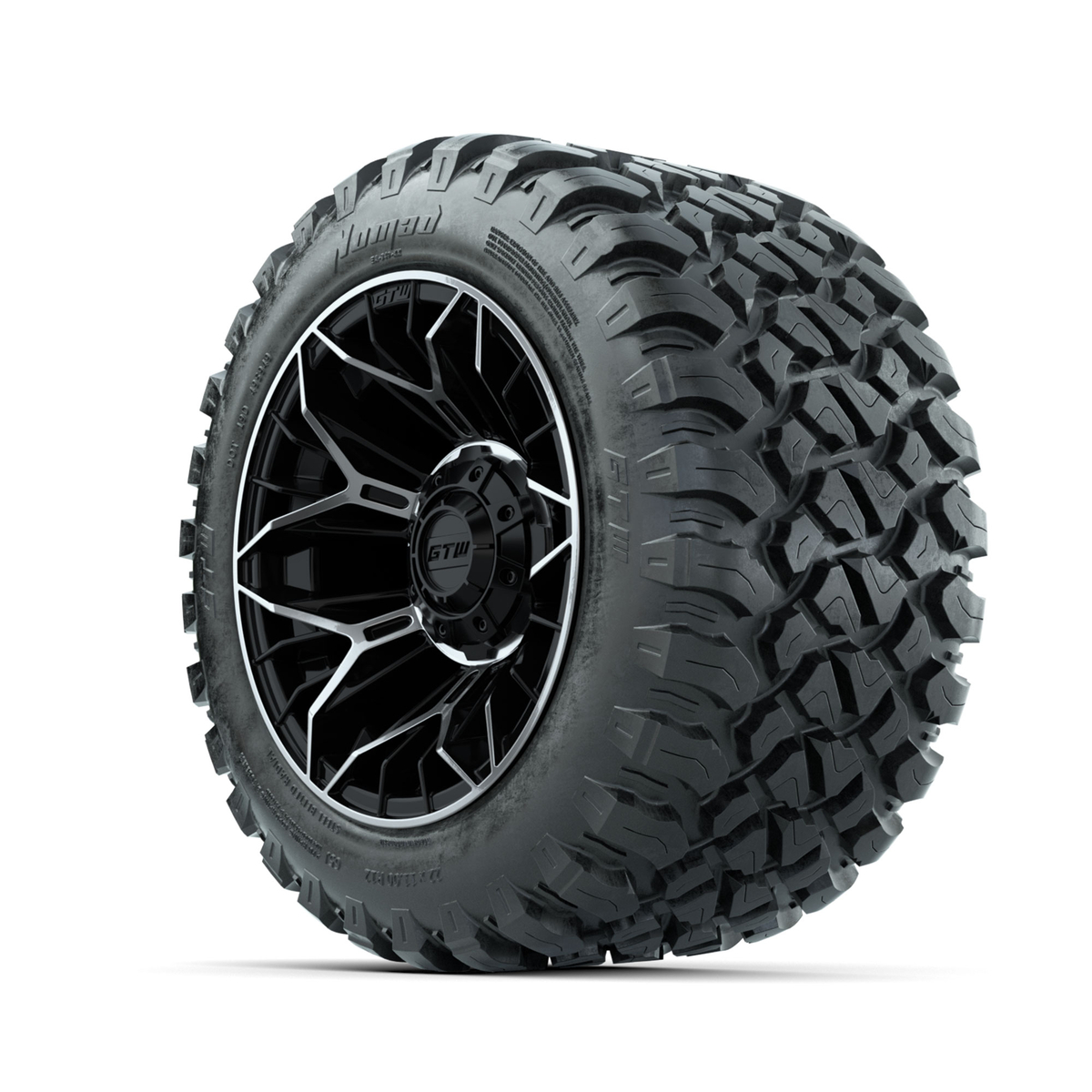 A set of (4) 12-inch GTW® Stellar machined face with black golf cart wheels on 22x11-R12 GTW® Nomad Steel Belted All-Terrain Tires