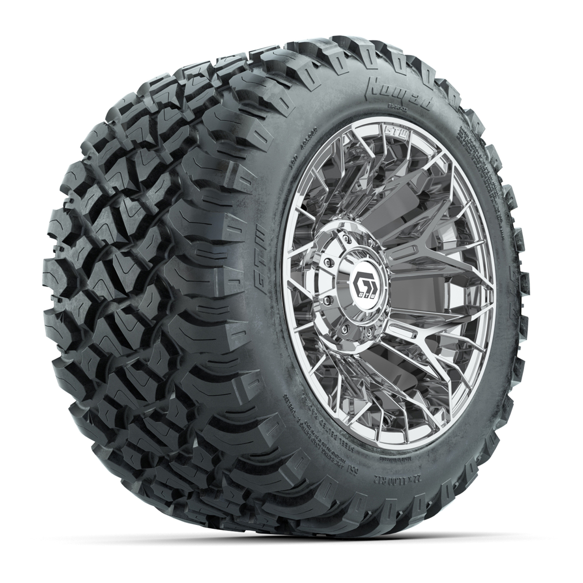 A set of (4) 12-inch GTW® Stellar Chrome golf cart wheels on 22x11-R12 GTW® Nomad Steel Belted All-Terrain Tires