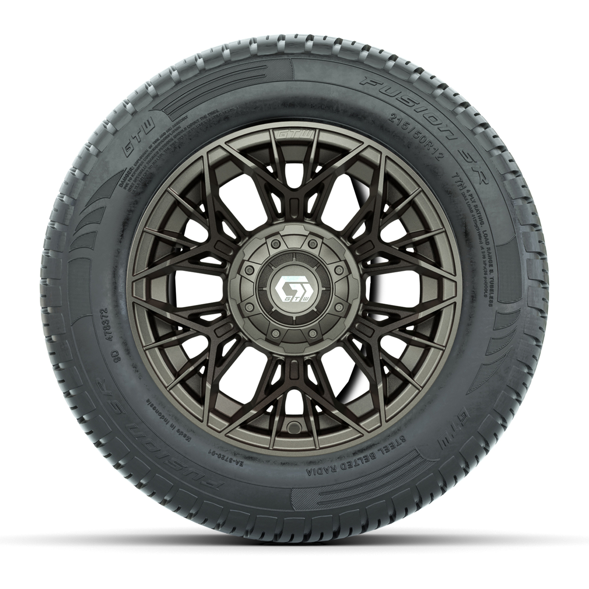 A set of (4) 12-inch GTW® Stellar Matte Bronze golf cart wheels on 215/50-R12 GTW® Fusion S/R Steel Belted Street Tires