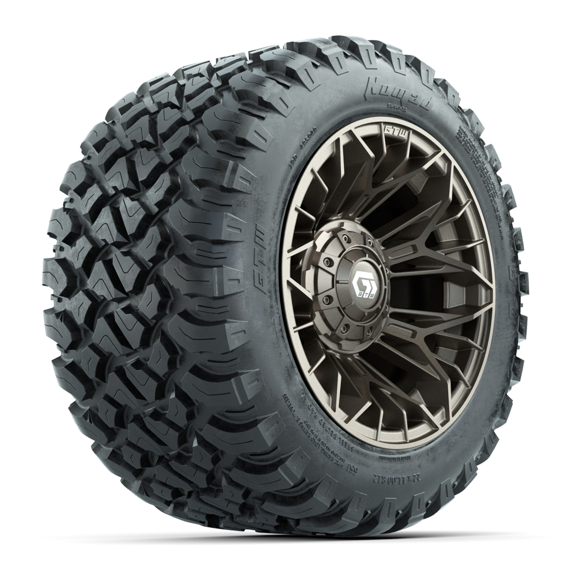 A set of (4) 12-inch GTW® Stellar Matte Bronze golf cart wheels on 22x11-R12 GTW® Nomad Steel Belted All-Terrain Tires