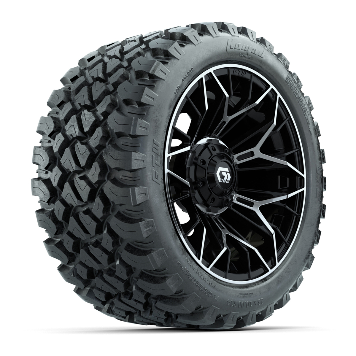 A set of (4) 14-inch GTW® Stellar machined face with black golf cart wheels on 23x10-R14 GTW® Nomad All-Terrain Tires