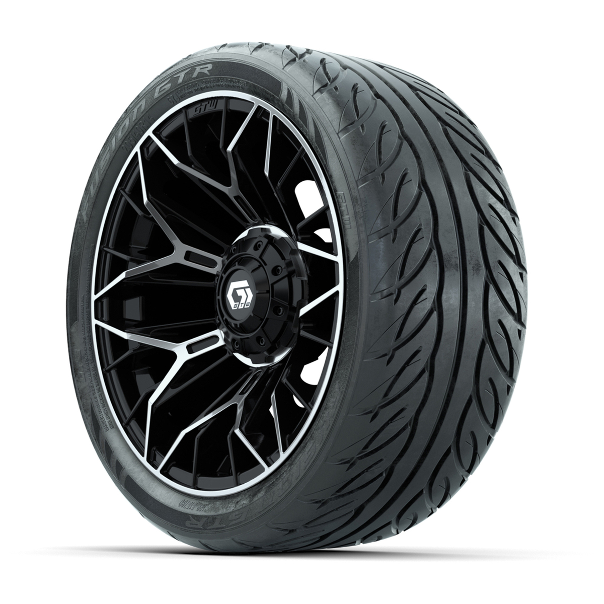 A set of (4) 14-inch GTW® Stellar machined face with black golf cart wheels on 205/40-R14 GTW® Fusion GTR Steel Belted Street Tires