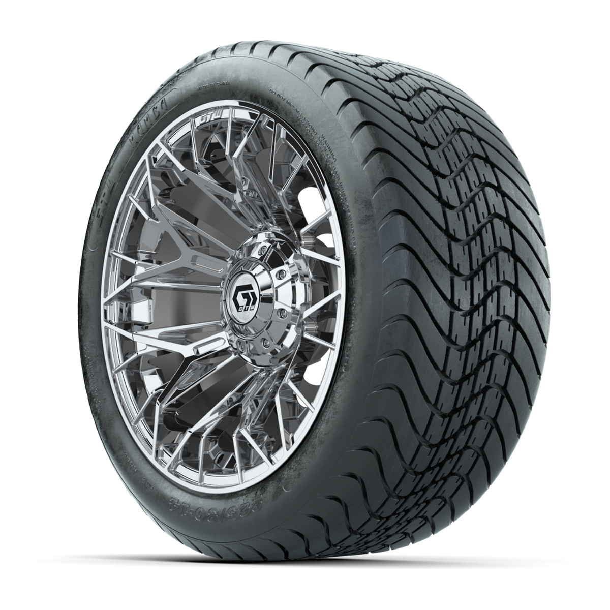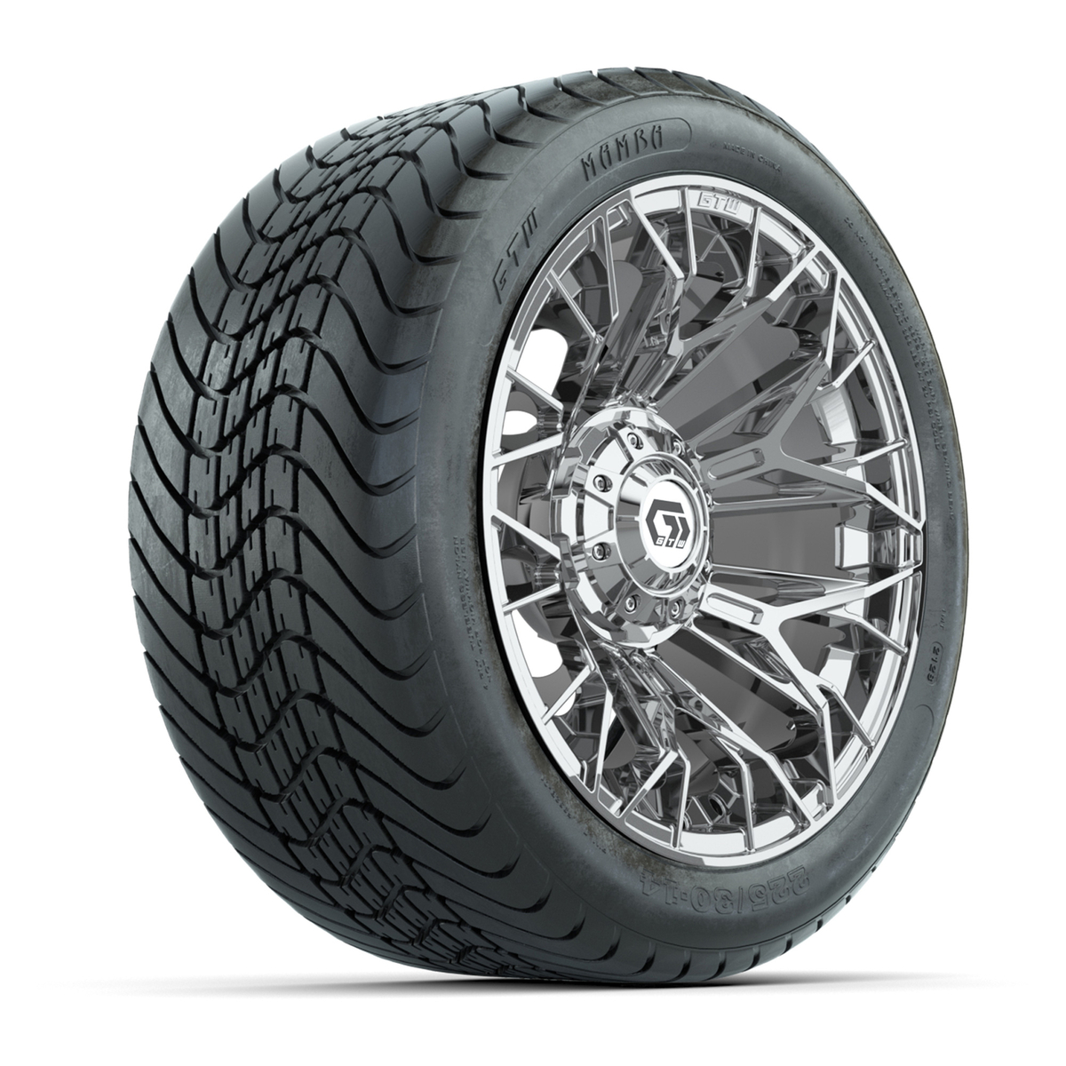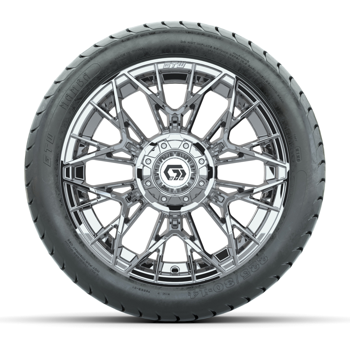 A set of (4) 14-inch GTW® Stellar Chrome golf cart wheels on 225/30-14 GTW® Mamba Street Tires