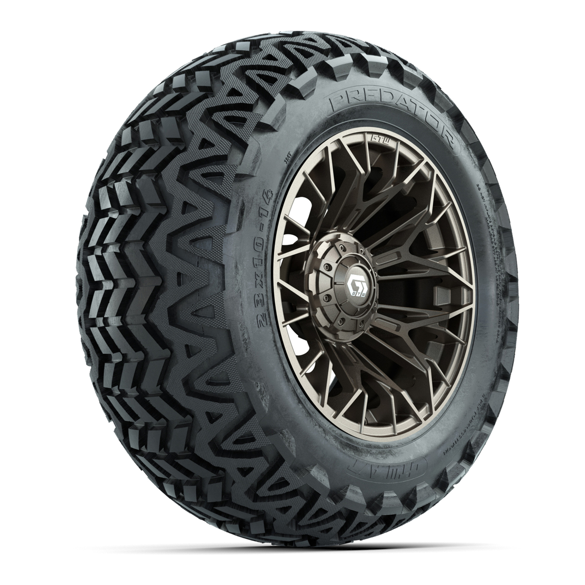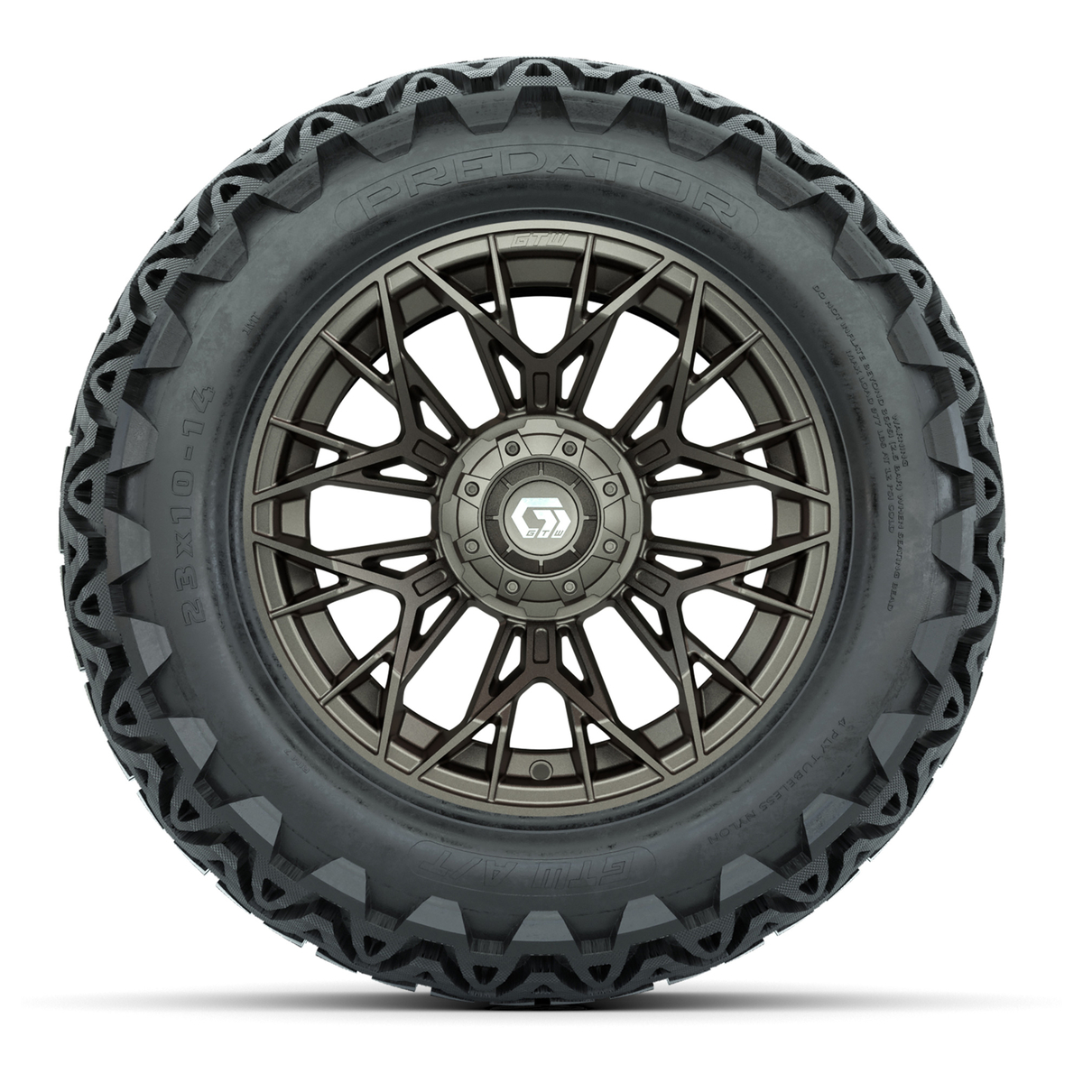 A set of (4) 14-inch GTW® Stellar Matte Bronze golf cart wheels on 23x10-14 GTW® Predator All-Terrain Tires