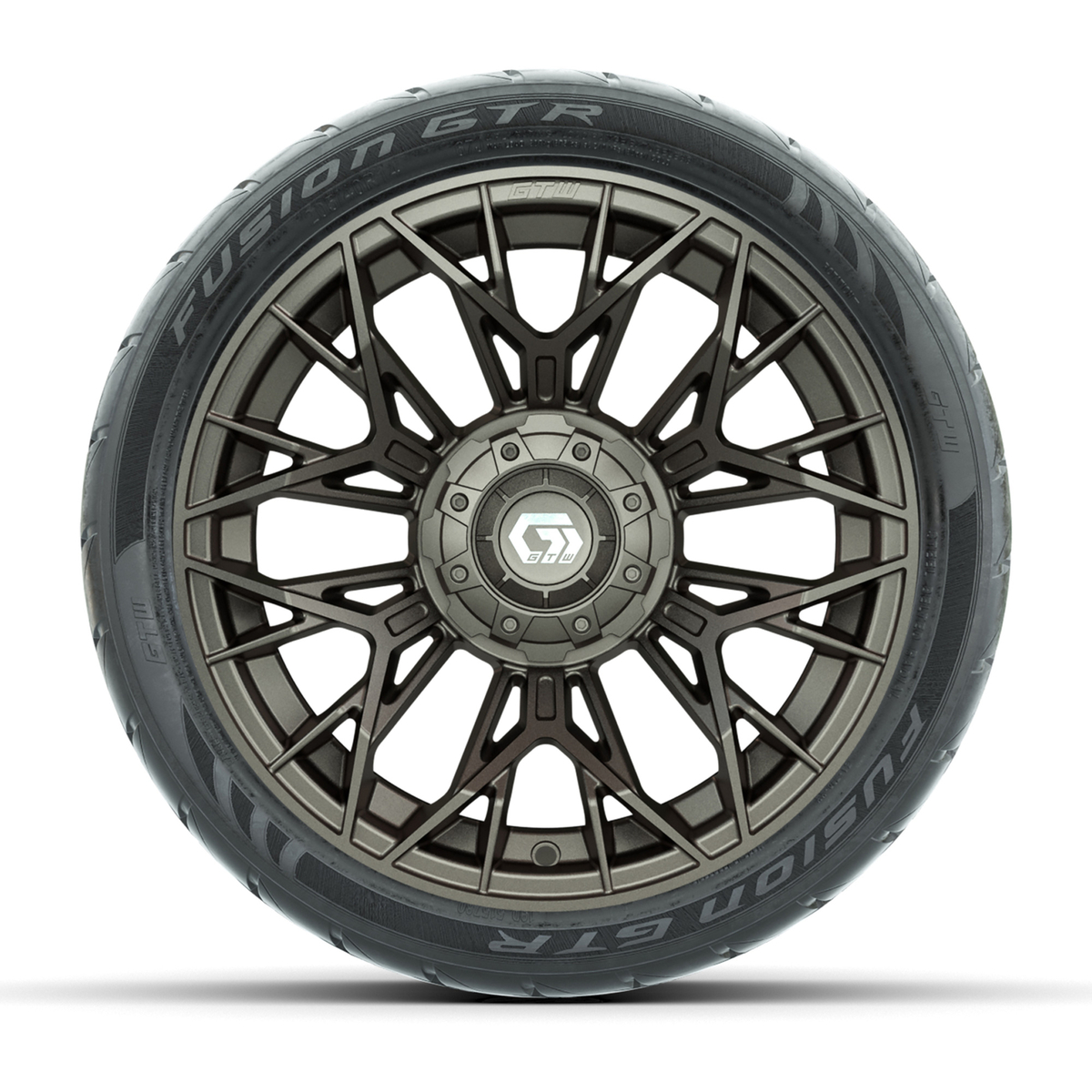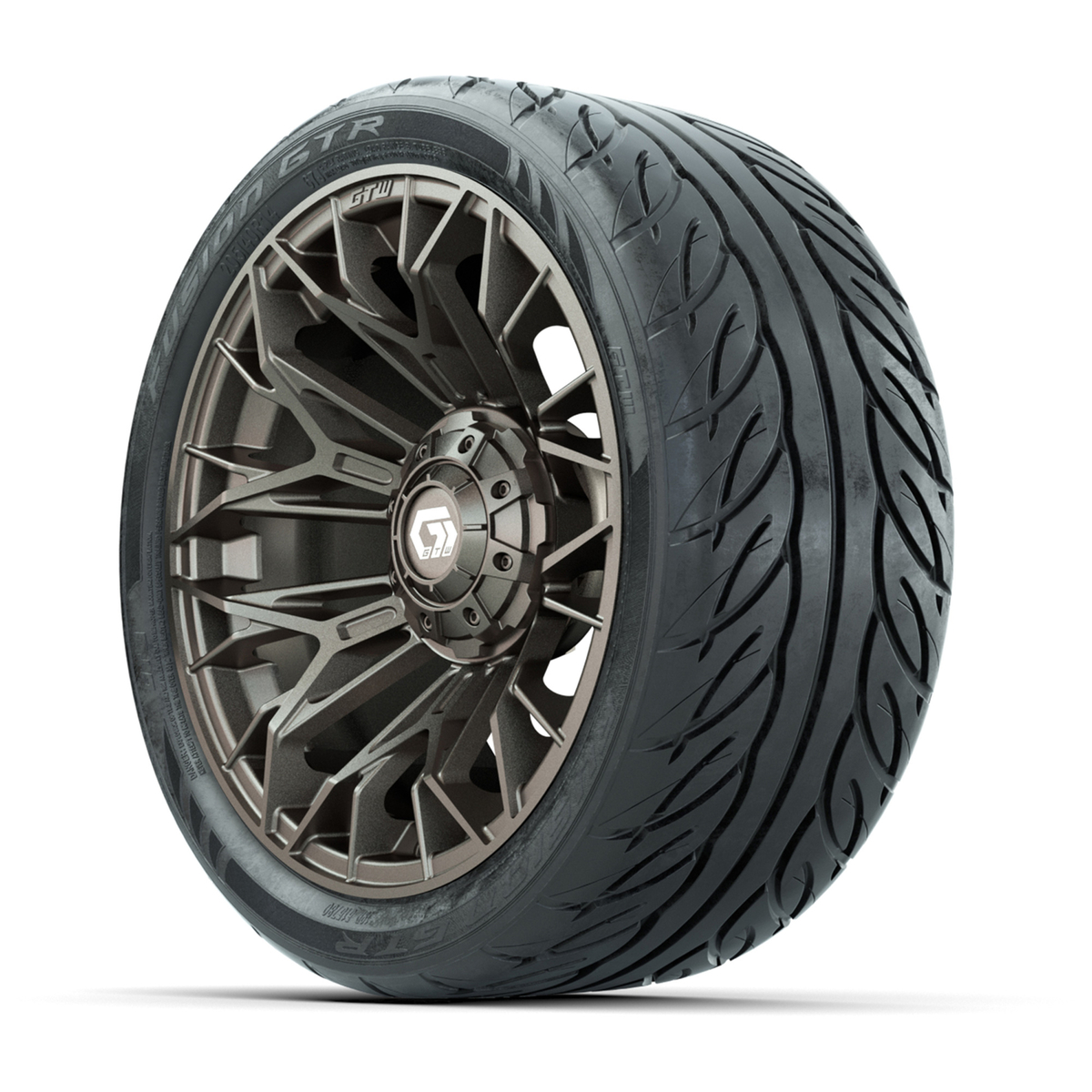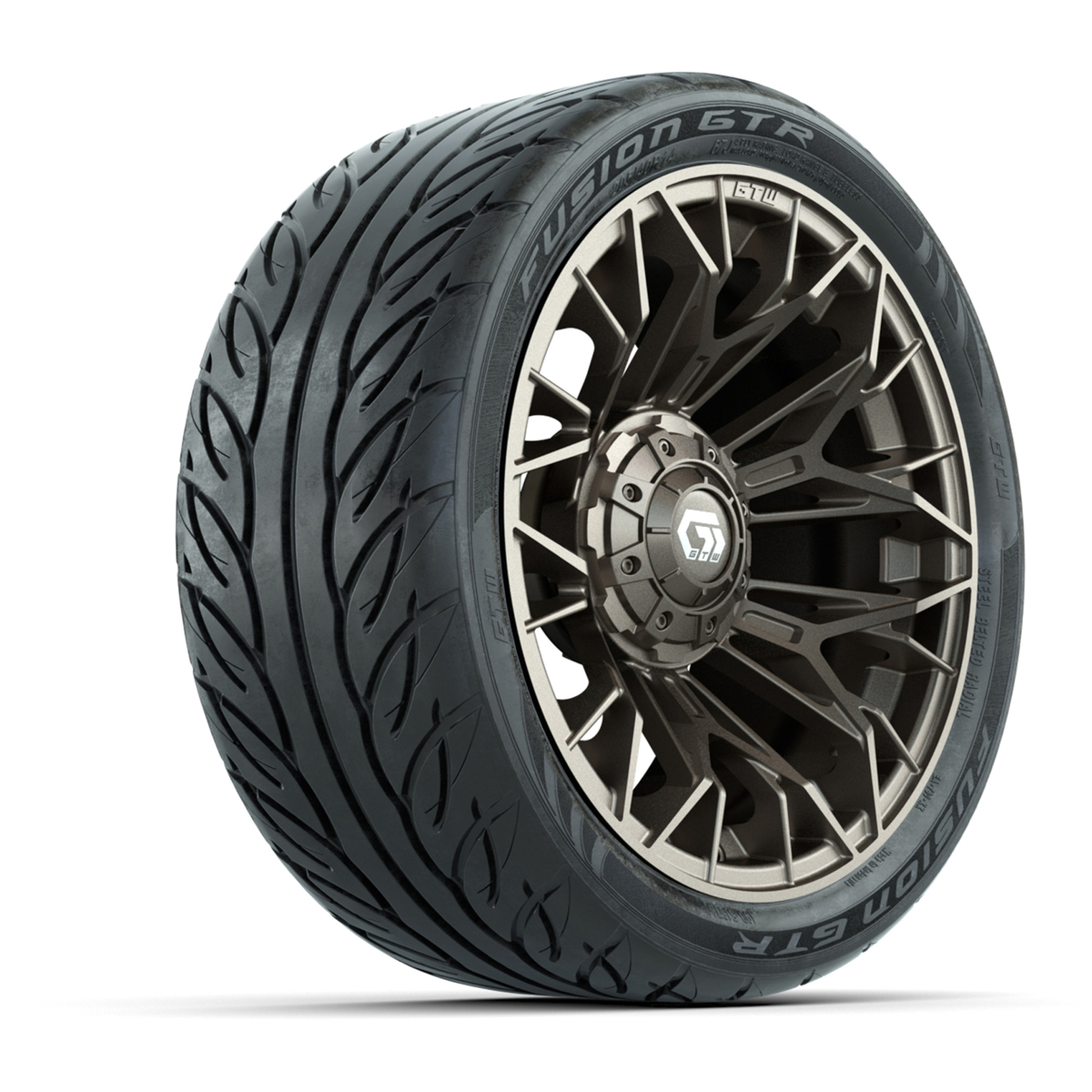 A set of (4) 14-inch GTW® Stellar Matte Bronze golf cart wheels on 205/40-R14 GTW® Fusion GTR Steel Belted Street Tires