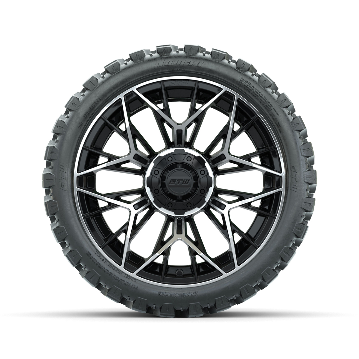 A set of (4) 15-inch GTW® Stellar machined face with black golf cart wheels on 23x10-R15 GTW® Nomad Steel Belted Radial All-Terrain Tires
