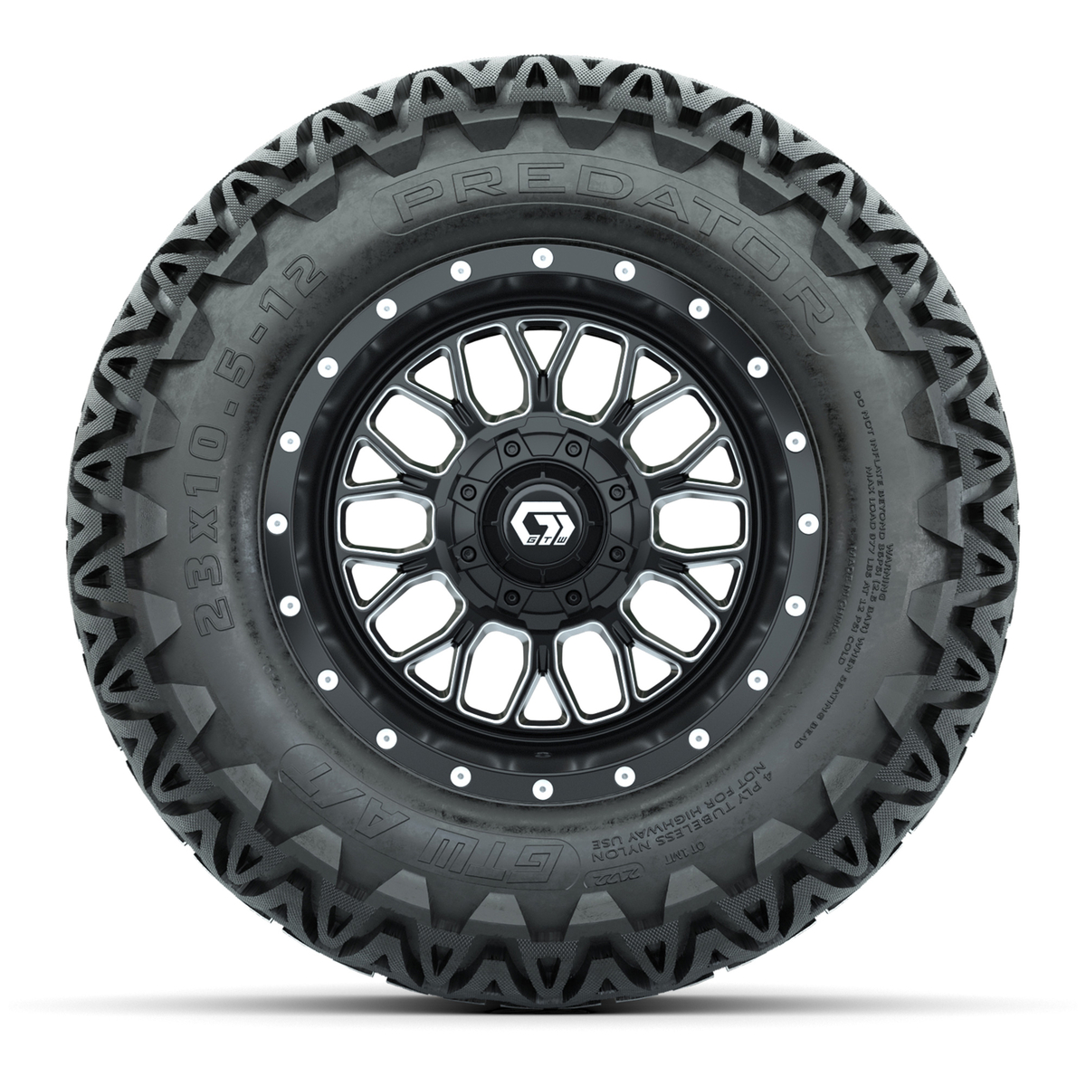 A set of (4) 12-inch GTW® Helix machined face with black golf cart wheels on 23x10.5-12 GTW® Predator All-Terrain Tires