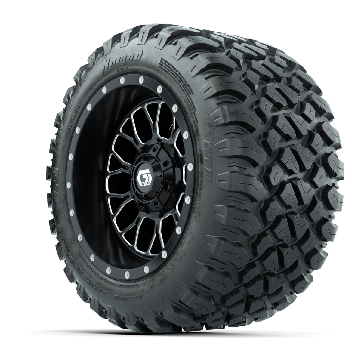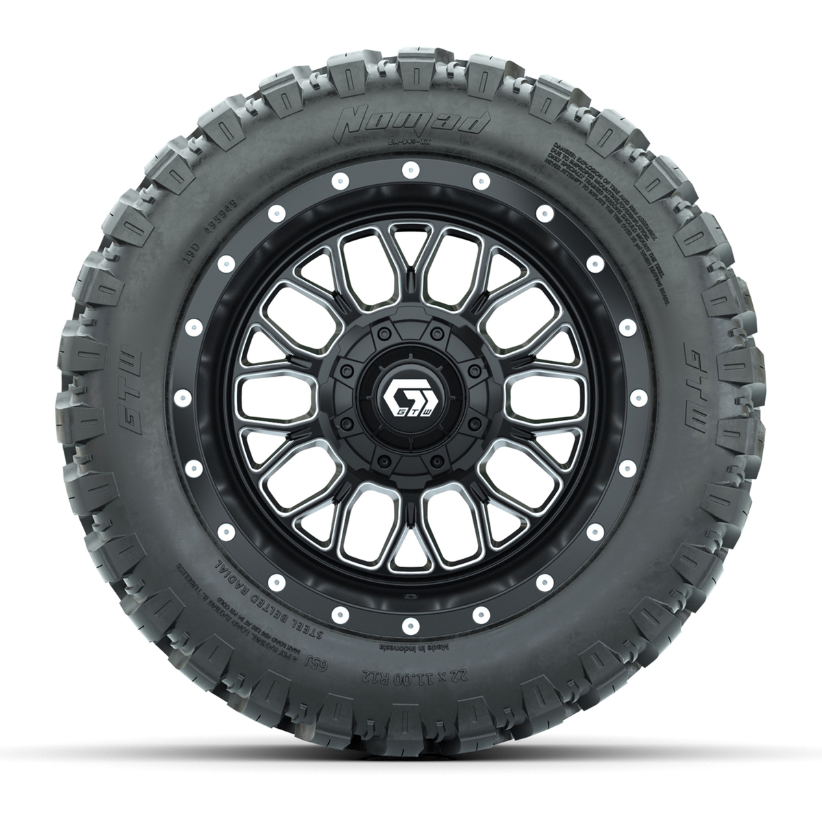 A set of (4) 12-inch GTW® Helix machined face with black golf cart wheels on 22x11-R12 GTW® Nomad Steel Belted All-Terrain Tires