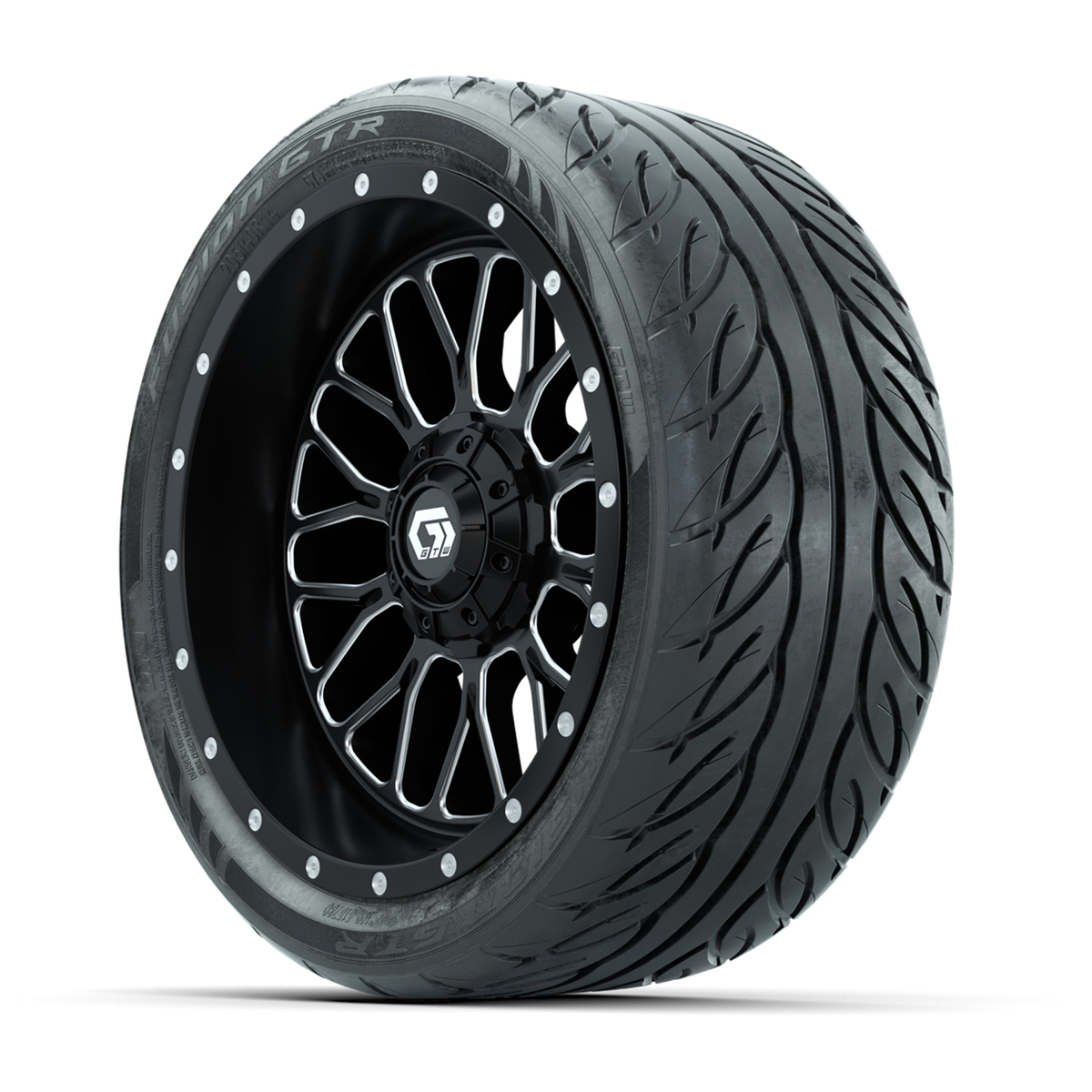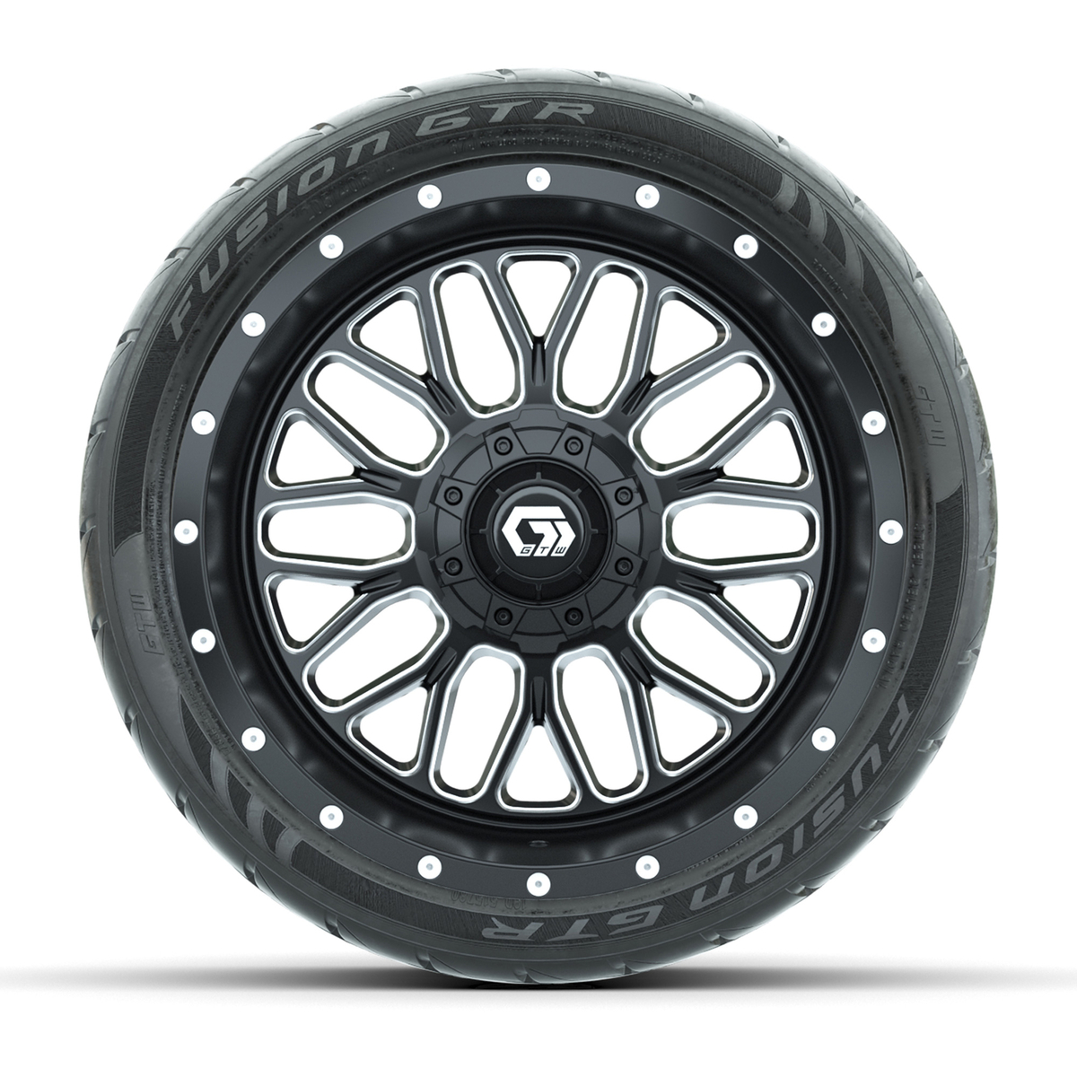 A set of (4) 14-inch GTW® Helix machined face with black golf cart wheels on 205/40-R14 GTW® Fusion GTR Steel Belted Street Tires