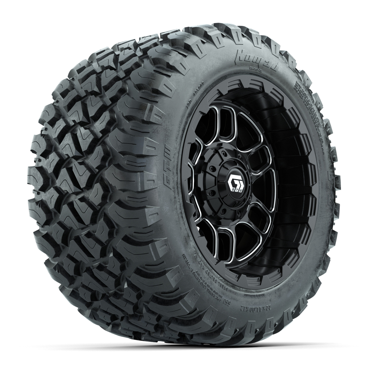 A set of (4) 12-inch GTW® Titan machined face with black golf cart wheels on 22x11-R12 GTW® Nomad Steel Belted All-Terrain Tires