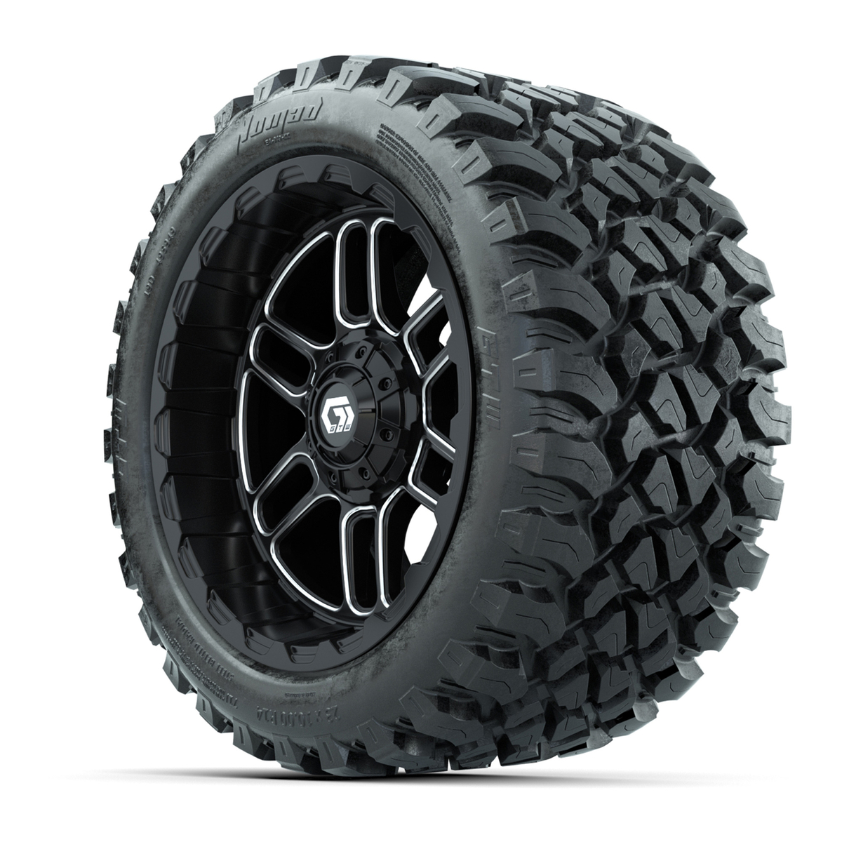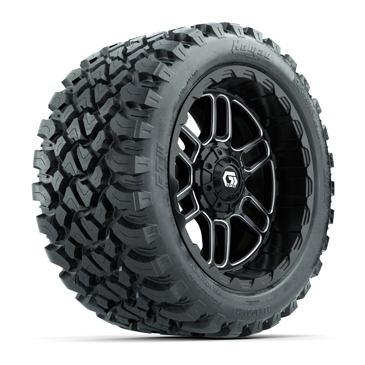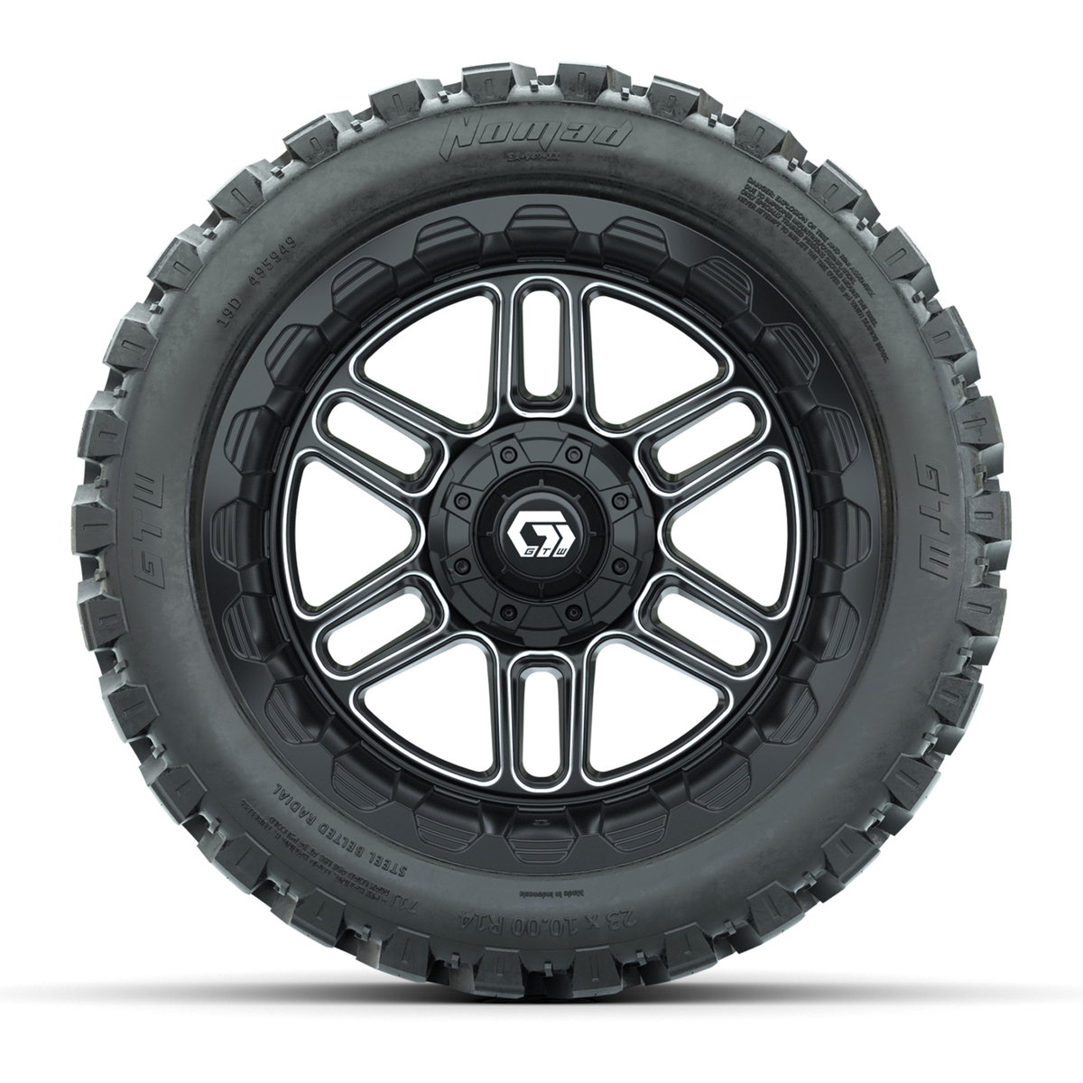 A set of (4) 14-inch GTW® Titan machined face with black golf cart wheels on 23x10-R14 GTW® Nomad All-Terrain Tires