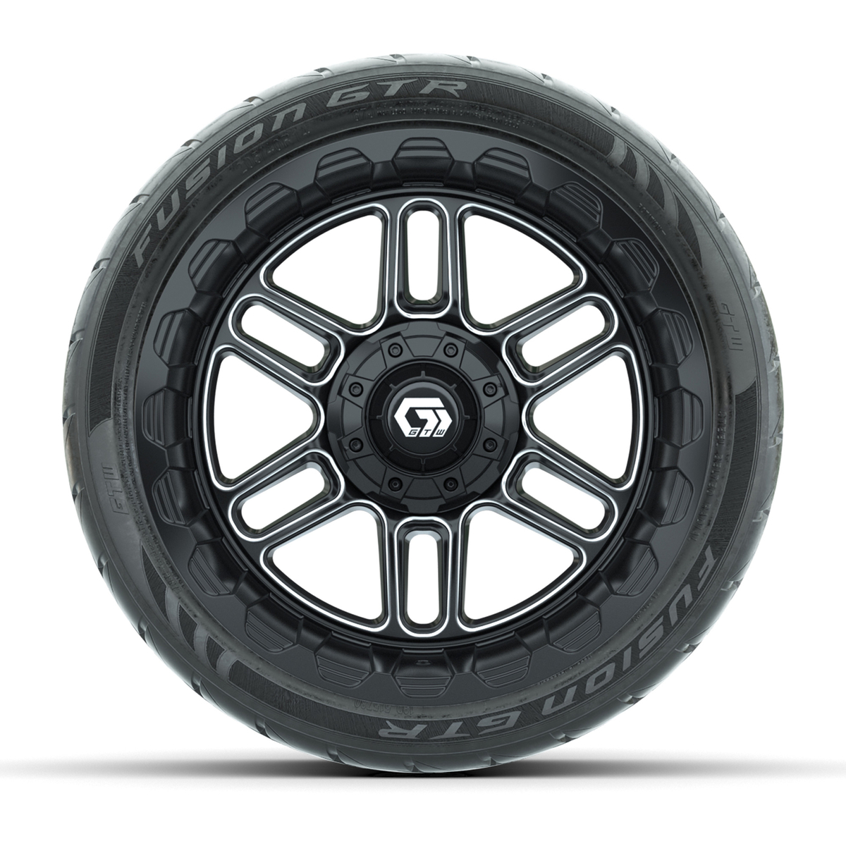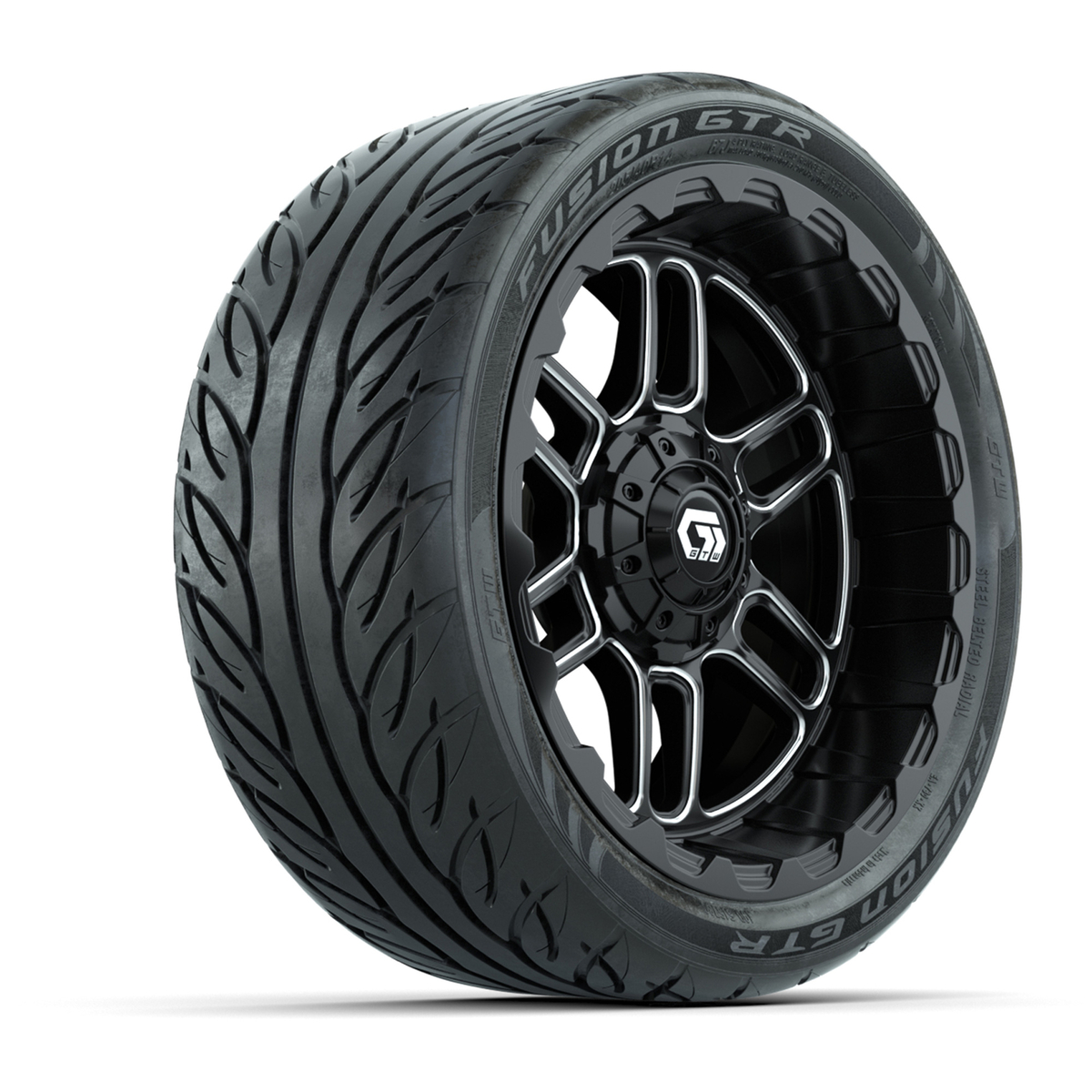 A set of (4) 14-inch GTW® Titan machined face with black golf cart wheels on 205/40-R14 GTW® Fusion GTR Steel Belted Street Tires