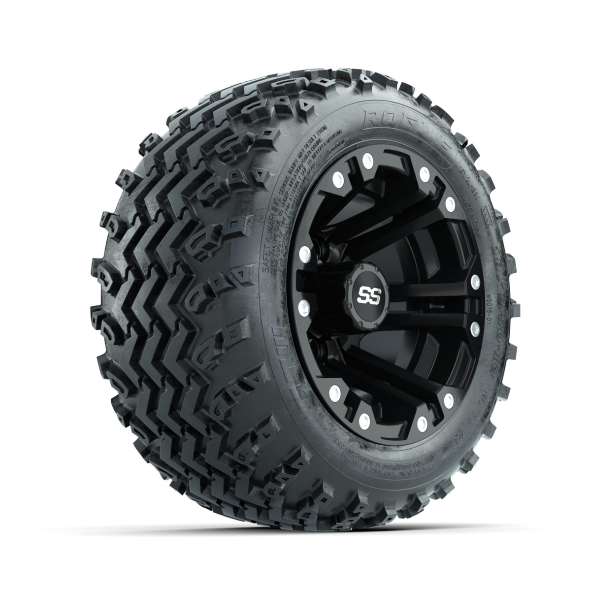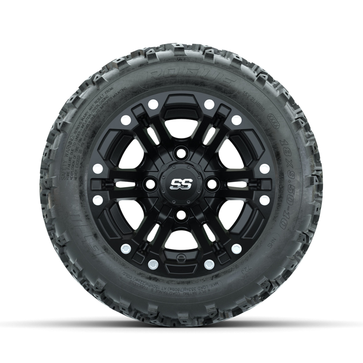 A set of (4) 10-inch GTW® Specter Matte Black golf cart wheels Mounted on 18x9.50-10 Rogue All-Terrain Tires