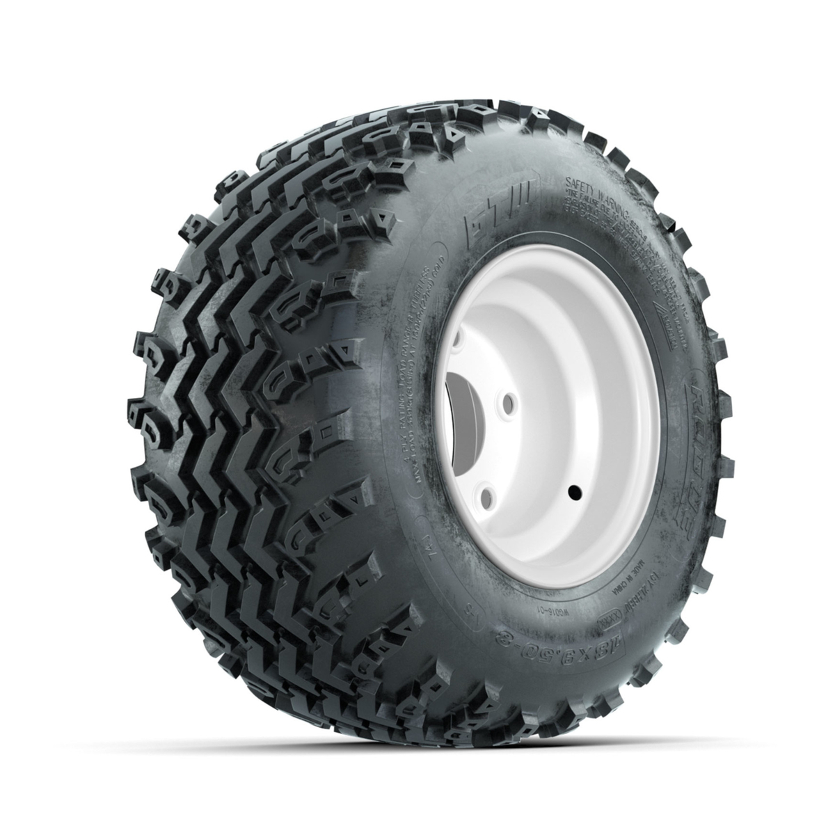 A set of (4) 8-inch GTW® Steel White Centered 5-Hole golf cart wheels Mounted on 18x9.50-8 Rogue All-Terrain Tires