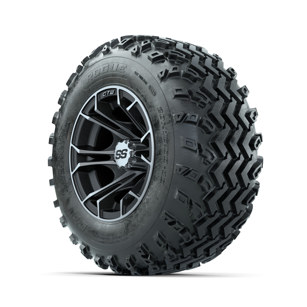 A set of (4) 10-inch GTW® Spyder Machined/Matte Grey golf cart wheels Mounted on 20x10.00-10 Rogue All-Terrain Tires