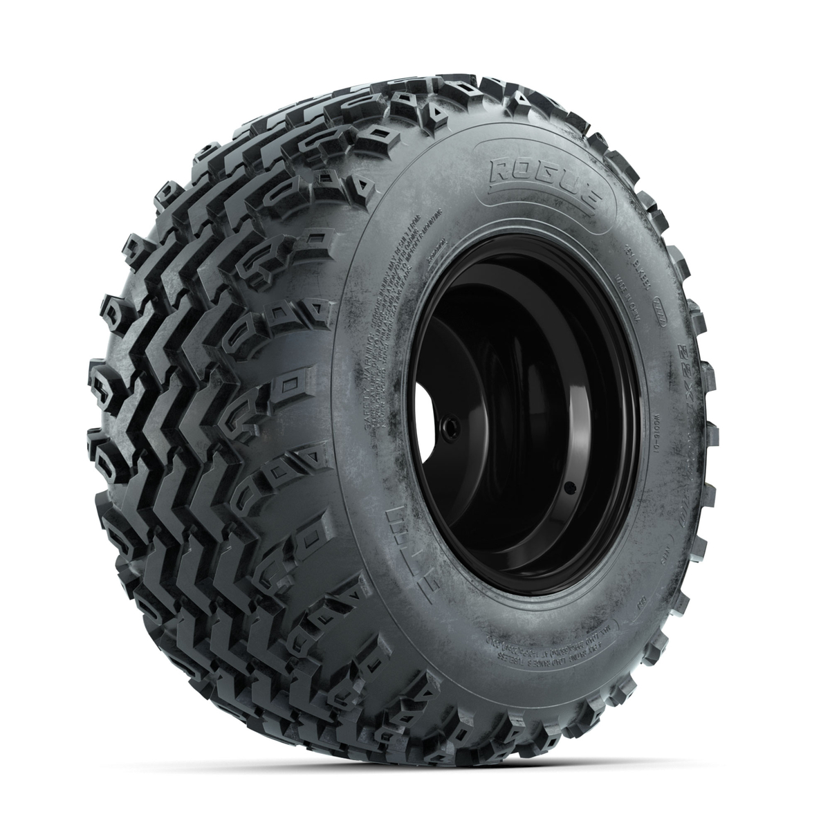 A set of (4) 10-inch GTW® Steel Matte Black 3:5 Offset golf cart wheels Mounted on 22x11.00-10 Rogue All-Terrain Tires