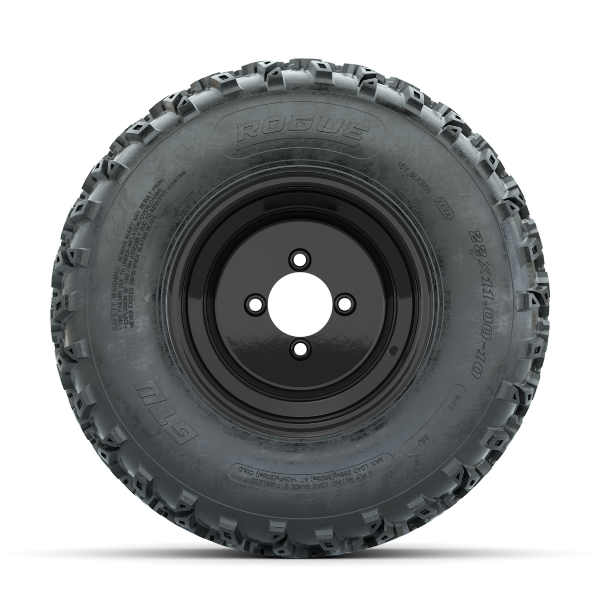 A set of (4) 10-inch GTW® Steel Black golf cart wheels Mounted on 22x11.00-10 Rogue All-Terrain Tires