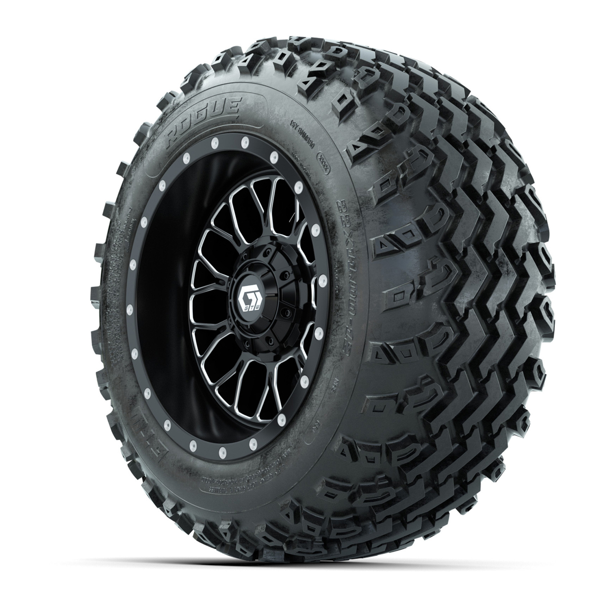 A set of (4) 12-inch GTW® Helix Machined/Black golf cart wheels Mounted on 22x11.00-12 Rogue All-Terrain Tires